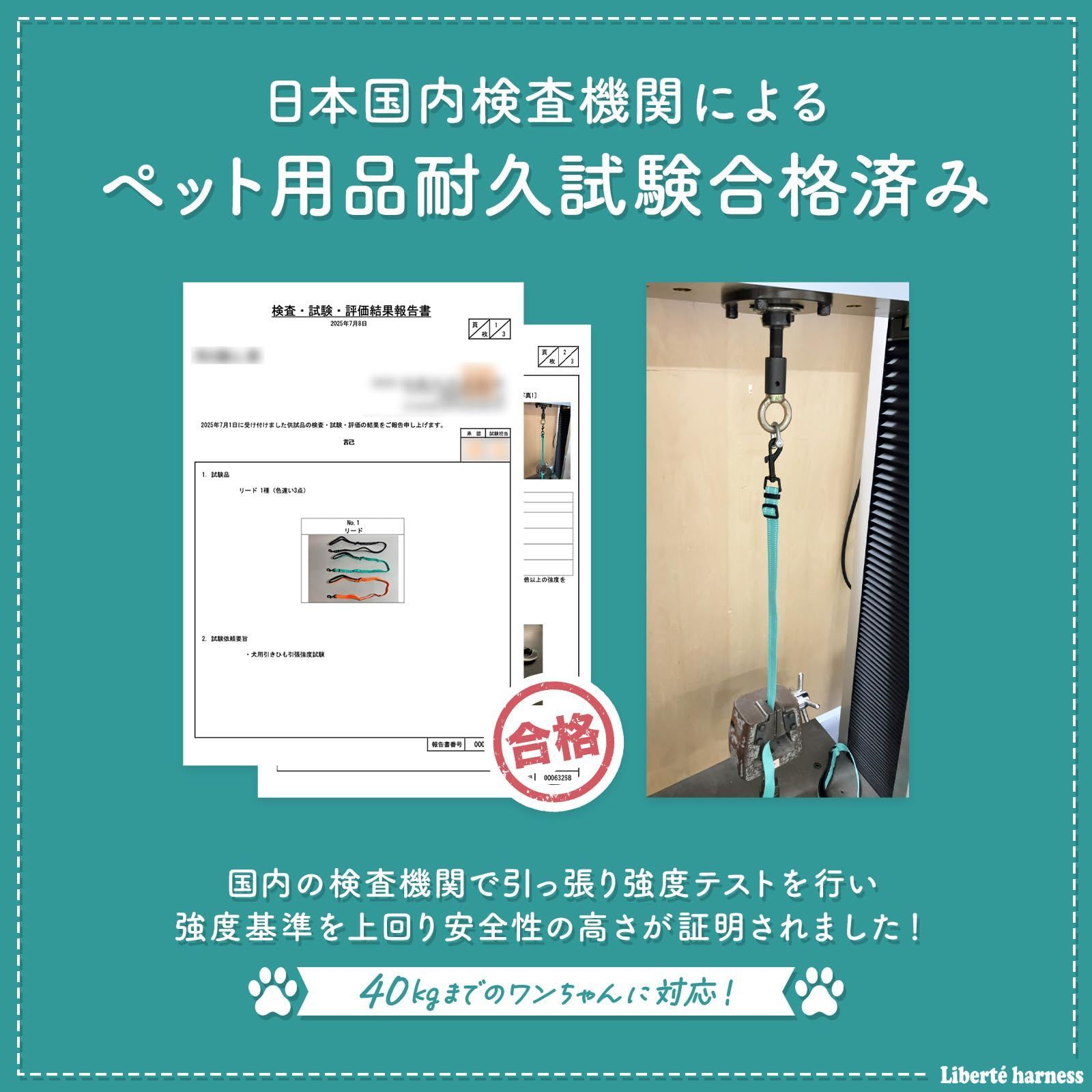 【国内検査機関の耐久テストクリア】40kgまでの犬に対応。引っ張り強度試験を実施した結果、強度基準を上回り安全性が高いことが証明されました。日本国内の品質基準を満たした安心のリードです。
