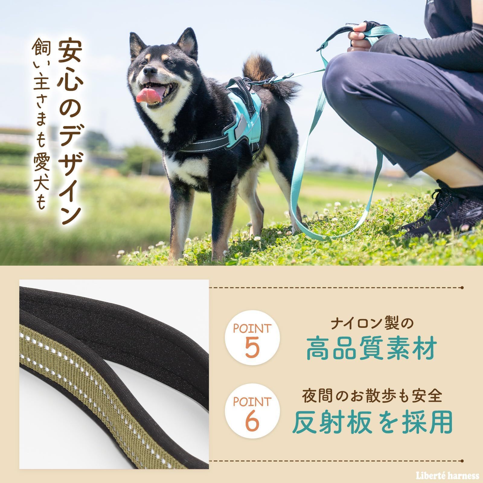 【夜間も安心の反射素材】反射板付きだから暗い道でも安心。夜のお散歩を安全にサポートします。