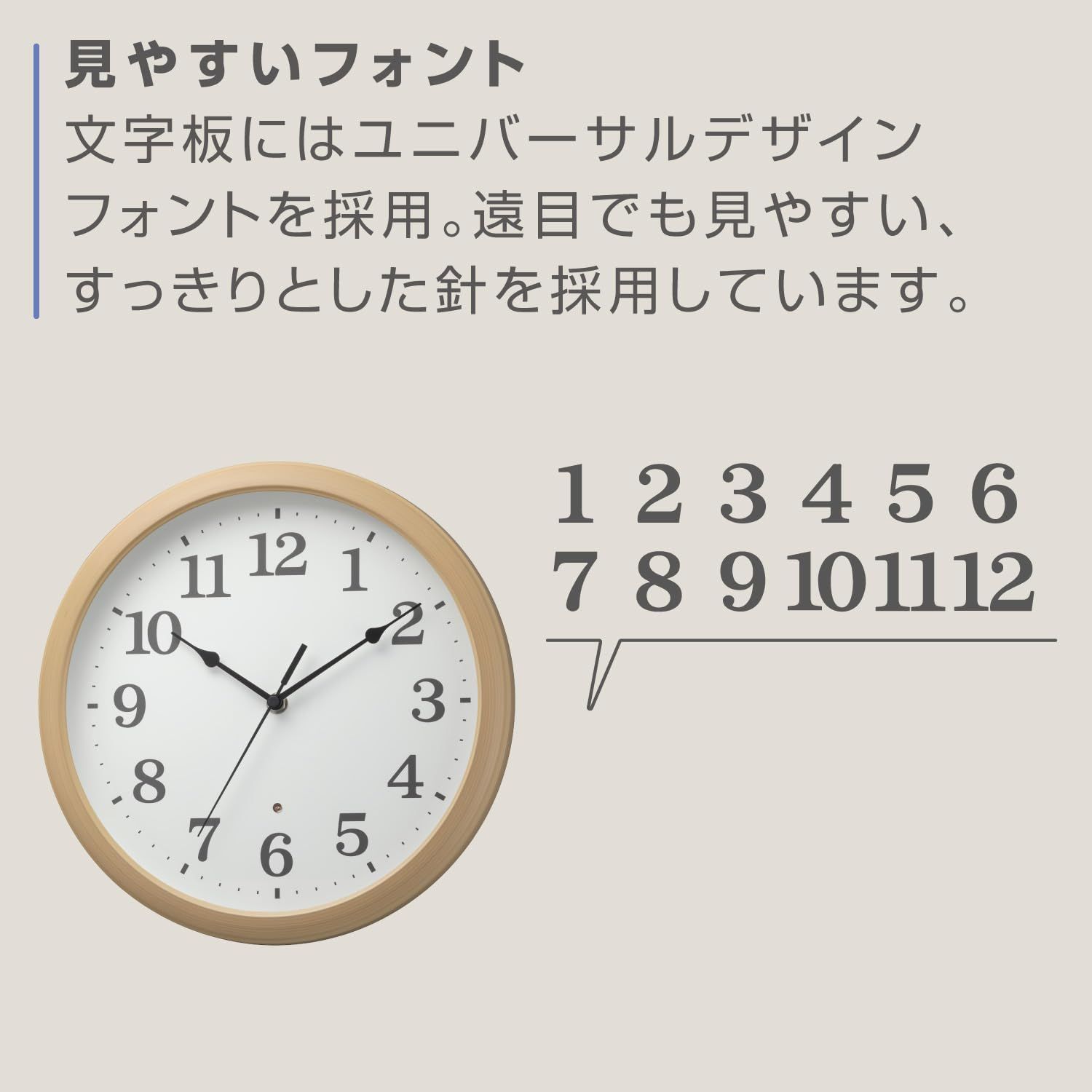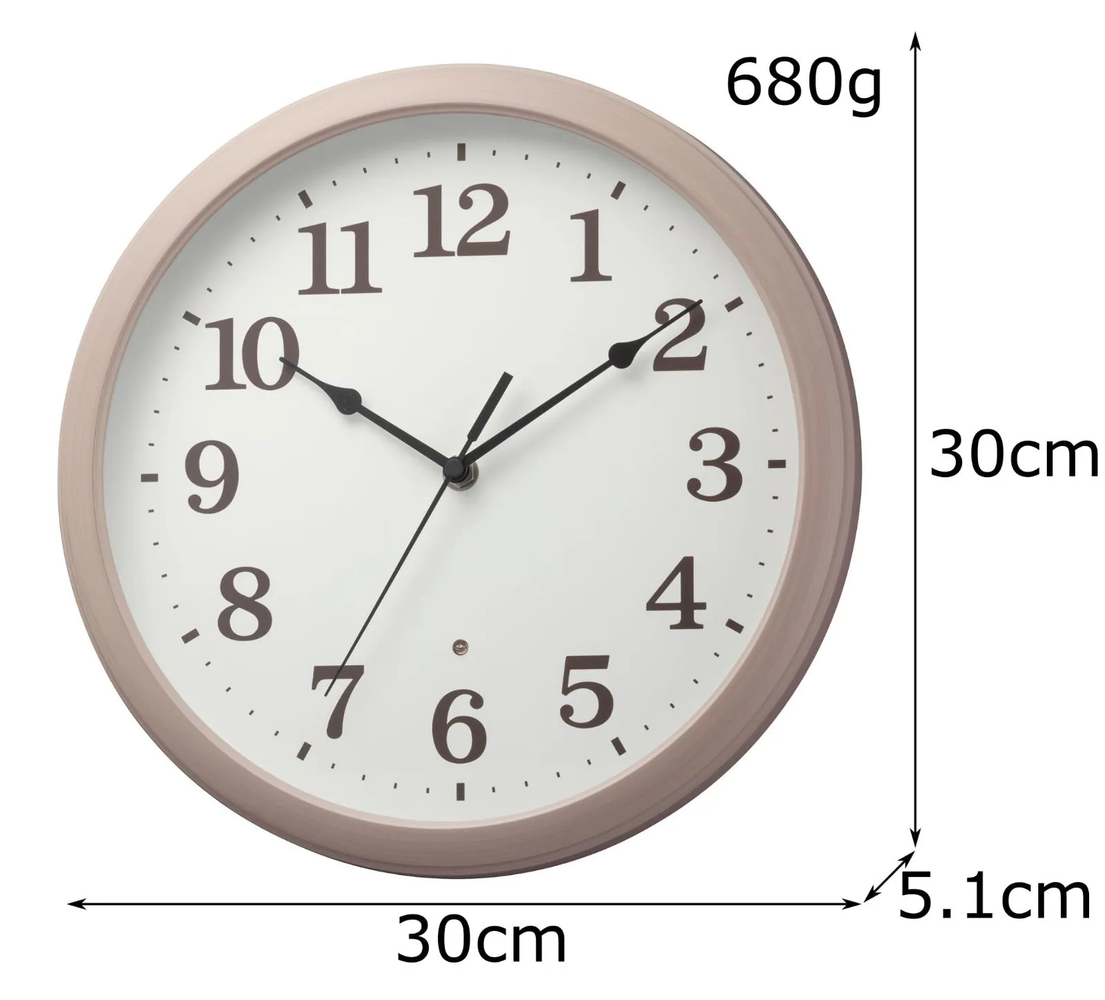 サイズ:30×30×5.1cm 質量:680g 使用電源:単3形アルカリ×5本(電池別売) 材質:プラスチック枠/ガラス風防 ムーブメント:クオーツ 秒針:連続秒針(スーッと滑らかに動く) 文字板:ユニバーサルデザインフォント使用 暗所自動照明:AUTO(音を感知し約45秒間点灯)/OFF/ON(常時点灯)から選択式