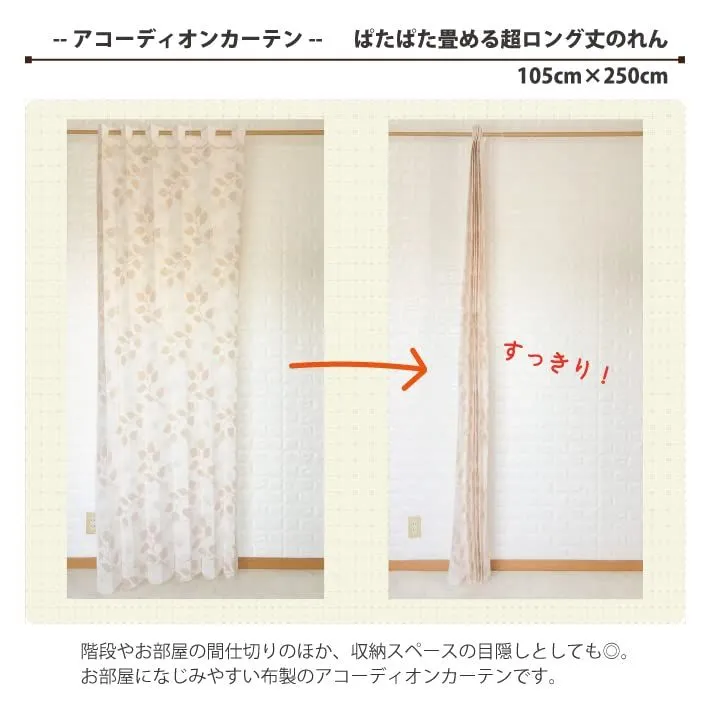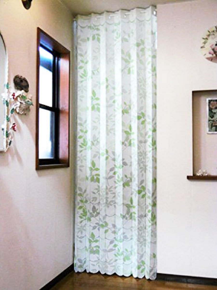 遮熱断熱 間口を仕切って冷暖房効率アップ ロングアコーディオンカーテンのれん「リーフ」 幅105×丈250cm (グリーンリーフ)