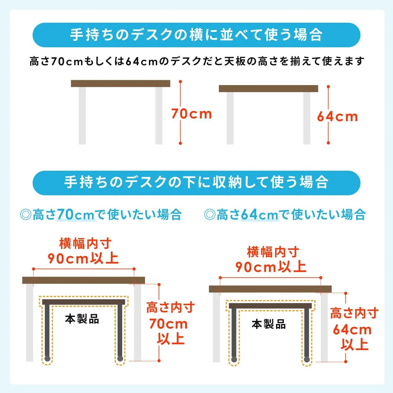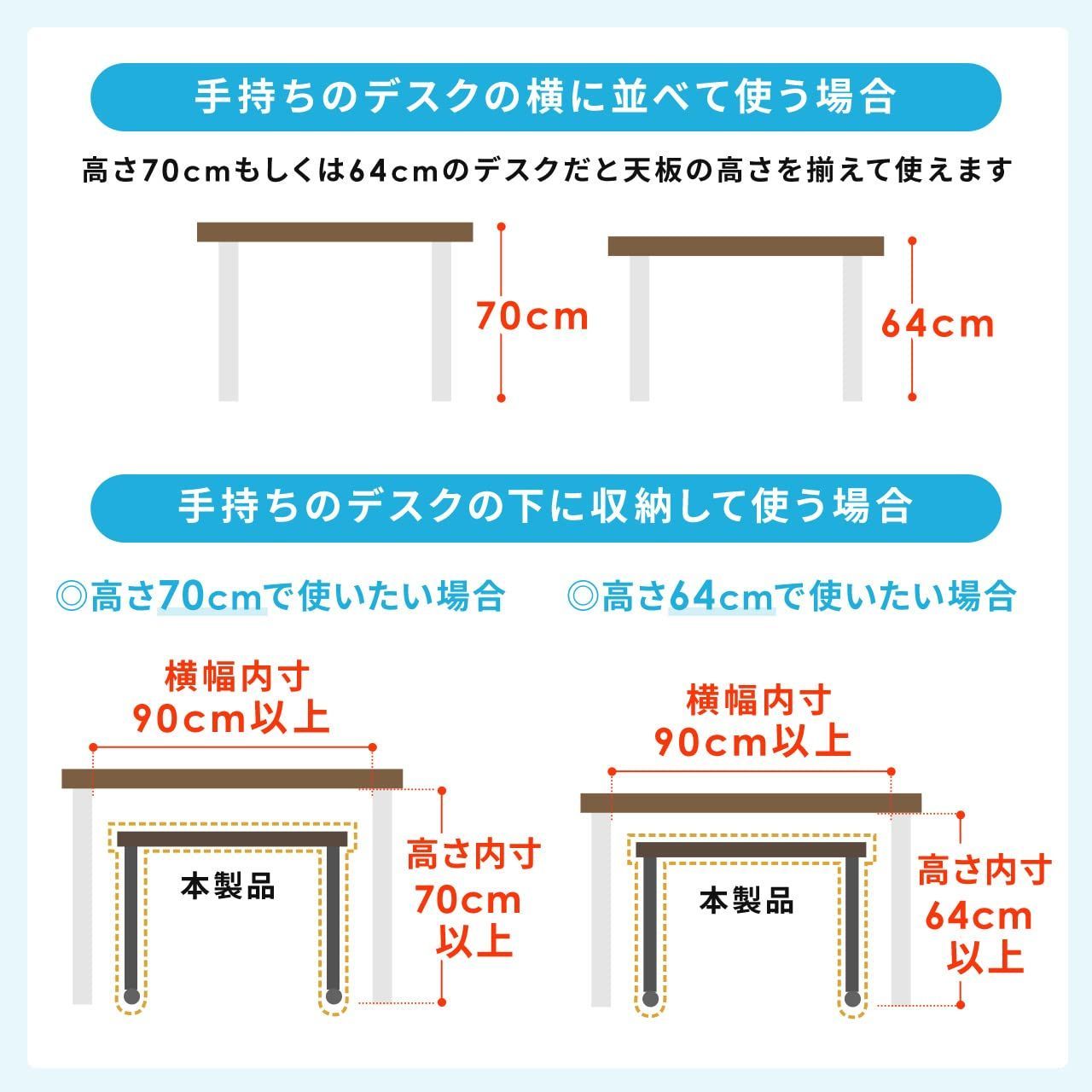 天板の高さを64cmにすれば、使わないときはデスクの下に収納したり、キーボード台として使用可能です。