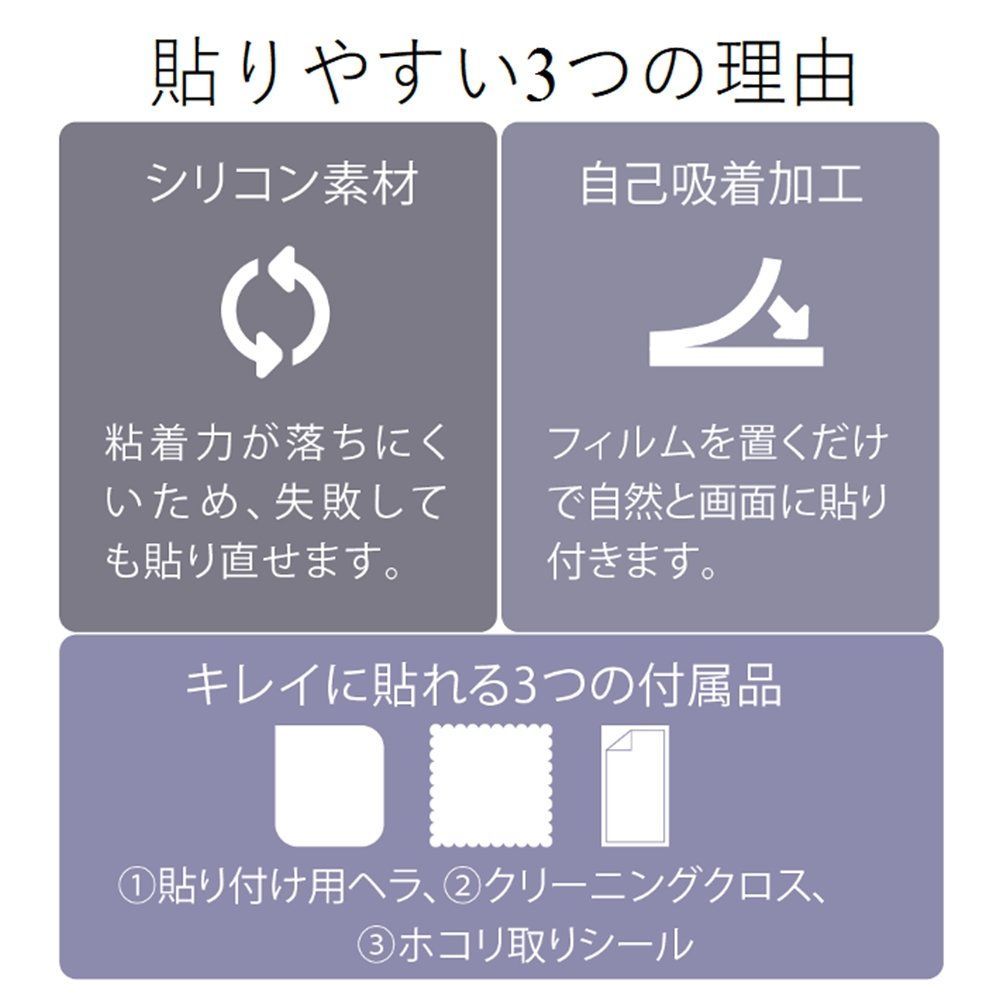 セット内容:液晶保護フィルム(エアーレス防指紋反射防止仕様)×1、フィルム貼付用ヘラ×1、ホコリ取りシール×1、クリーニングクロス×1