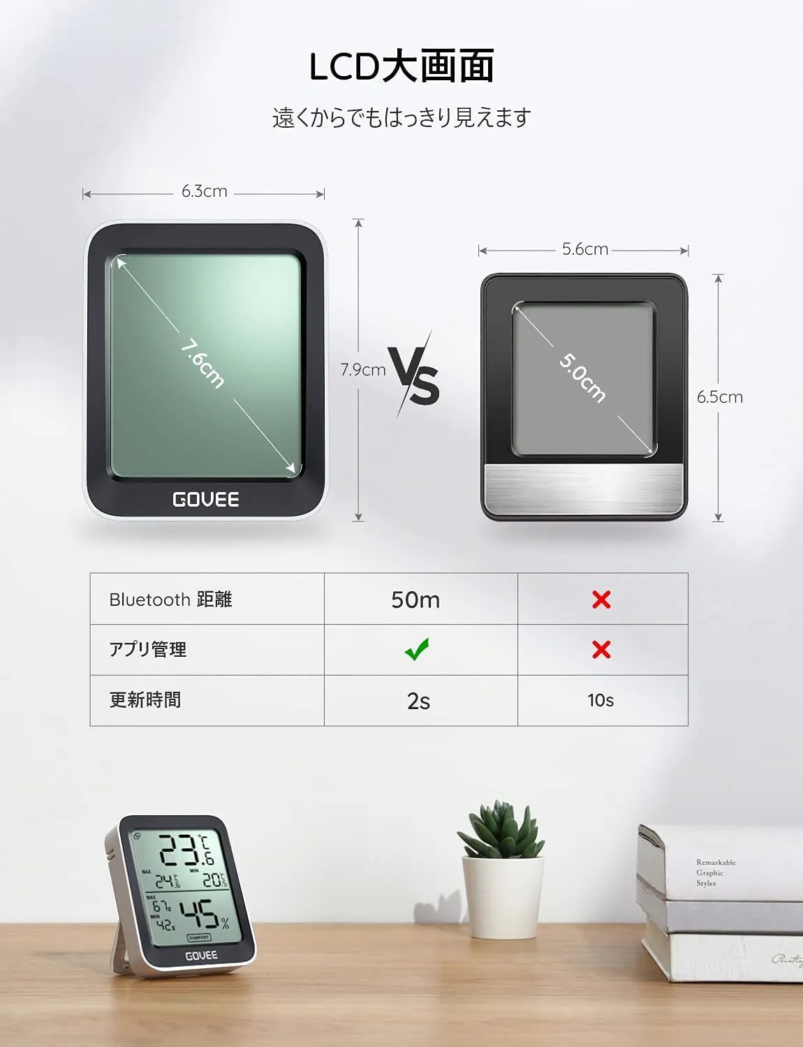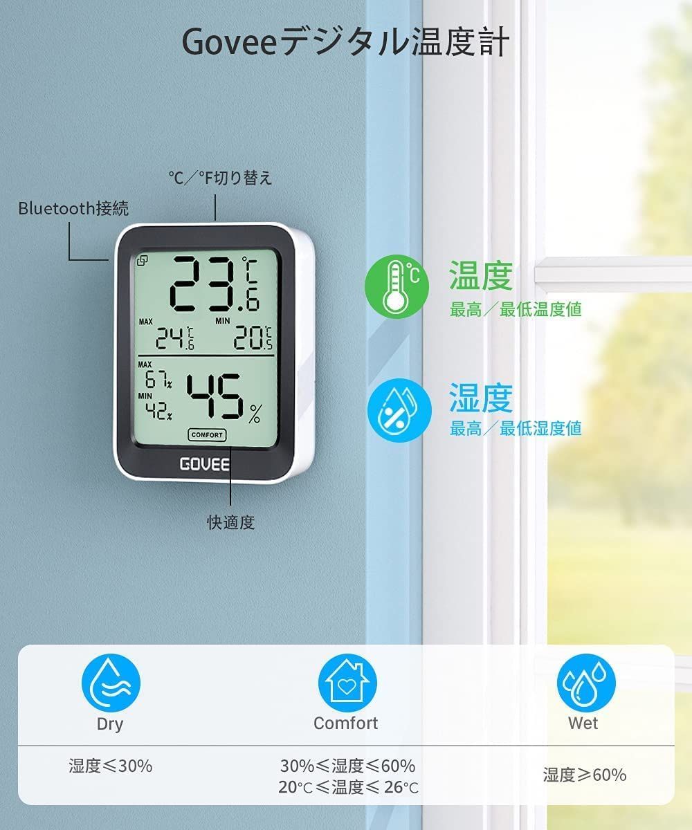 【履歴データ確認&データエクスポート】アプリに過去60日間(二ヶ月)のデータは保存できます。また、温度・湿度がグラフで可視化し、特定時刻の履歴データの確認が可能です。データ(CSVファイル)をエクスポートでき、お自宅の温湿度変化を確認できます。 ブランド Govee 特徴 コンパニオンアプリ, 高精度 色 ブラック 対象年齢 ベビー 付属コンポーネント AAAバッテリー(4つ) 外装素材 プラスチック ユニット数 1.0 個 電源 バッテリー式 表示を増やす 最後までご確認頂き誠にありがとうございました。 上記をご確認頂き、ご購入いただけましたら幸いです。 何かご不明な点がございましたらお気軽にメッセージからお問い合わせ下さい。