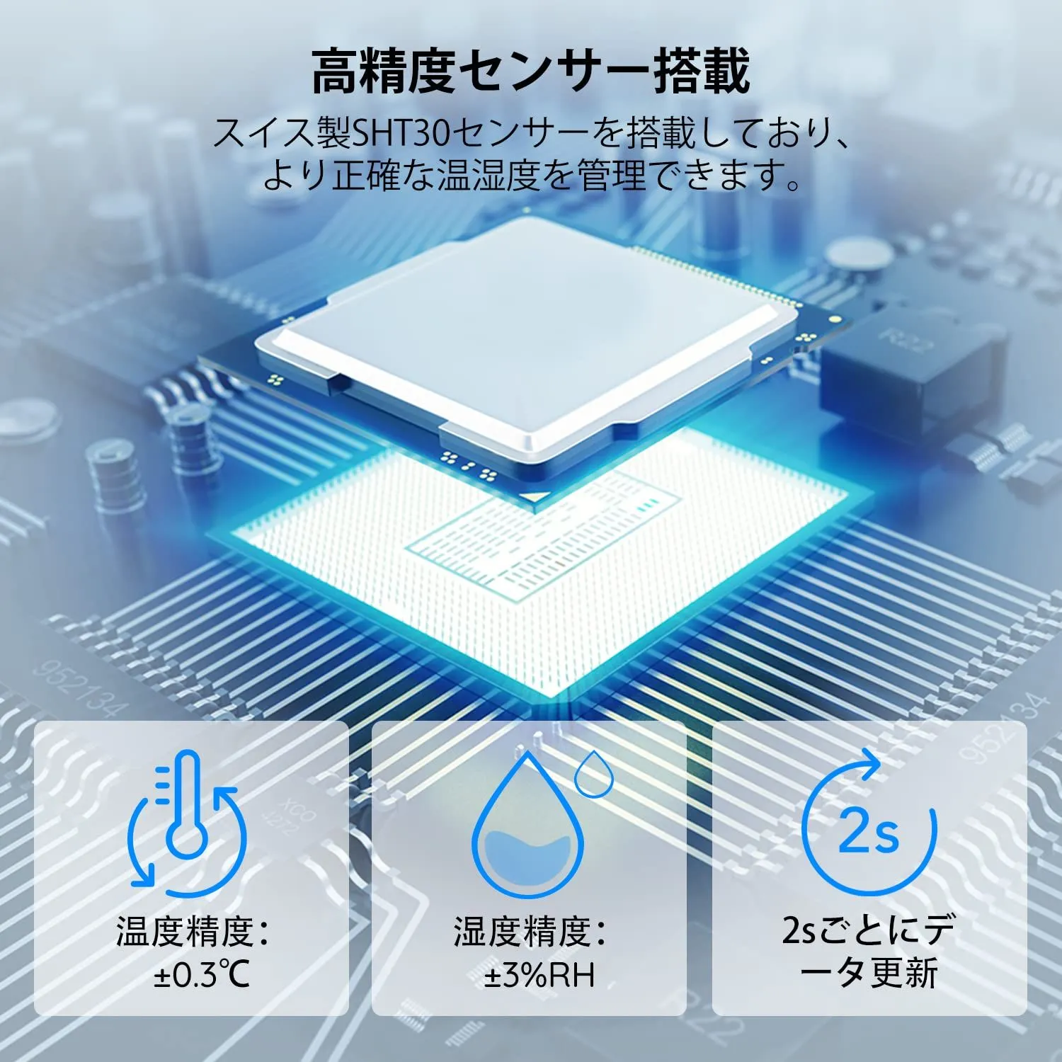 【高精度センサー搭載】スイス製のSHT30センサーを内蔵し、温度は最大±0.3°C、湿度は最大±3%RHの誤差で 、高精度で信頼性の高い温湿度測定を実現できます。また、2秒ごとにデータを更新し、精度と感度両方とも優れているデジタル温湿度計です。