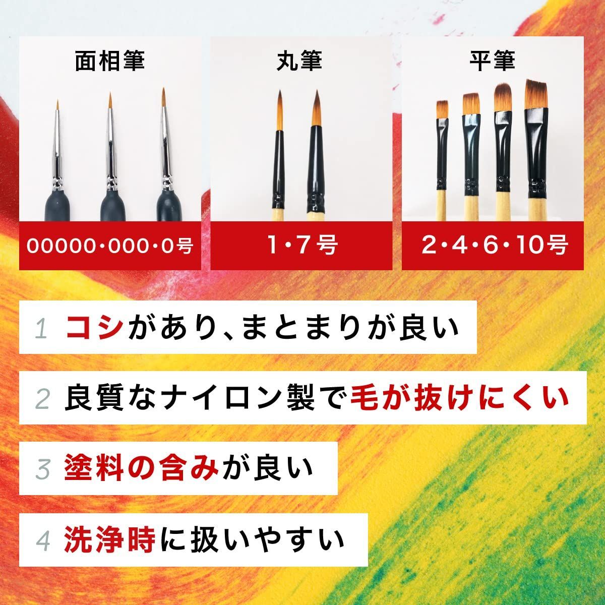 ?セット内容:平筆:4サイズ各1点(2・4・6・10号) 丸筆2サイズ各1点(1・7号) 面相筆:3サイズ各1点(00000・000・0号) マスキングテープ6㎜×17m・10㎜×17m各1点 塗料皿2点 撹拌棒1点 スポイト3㎜1点 収納ケース1点