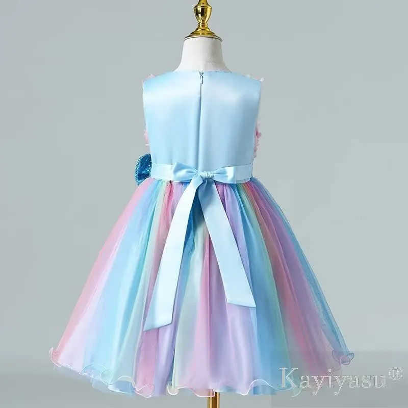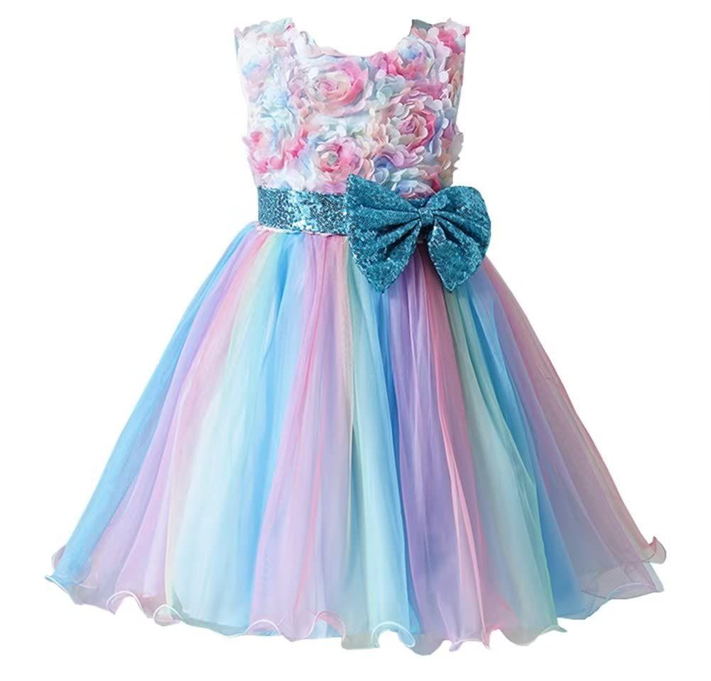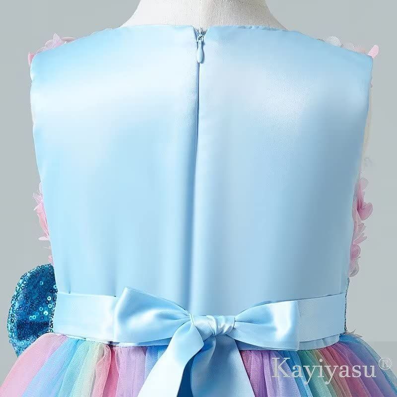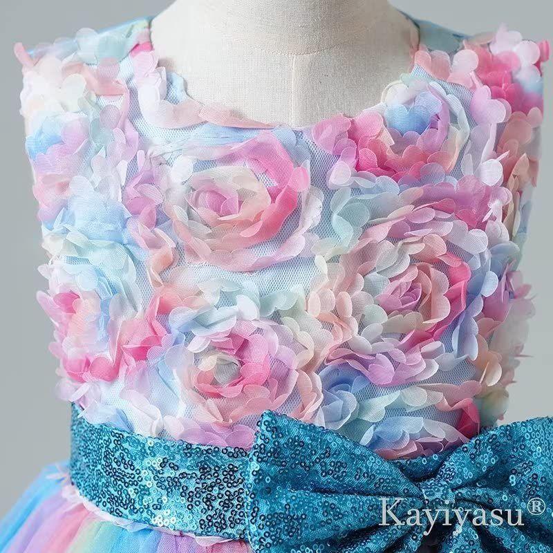 丸ネック 花柄 フォーマル スパンコール蝶結び 虹色 卒業式 女の子 入園式 ガールズ 発表会 ピアノ 誕生日 子供 ドレス 3-13歳 [Kayiyasu]