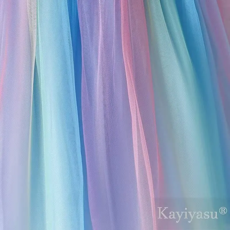 [デザイン] ジャンパースカートのデザインは、夏には涼しい、暑さを感じません。丸ネックライン、胸元には可愛い花柄刺繍があります。裾はチュールの生地、マルチカラーでファッションなエレガントです。腰では可愛い蝶結びがあります。裏側でファスナーがあて、着脱易いです。
