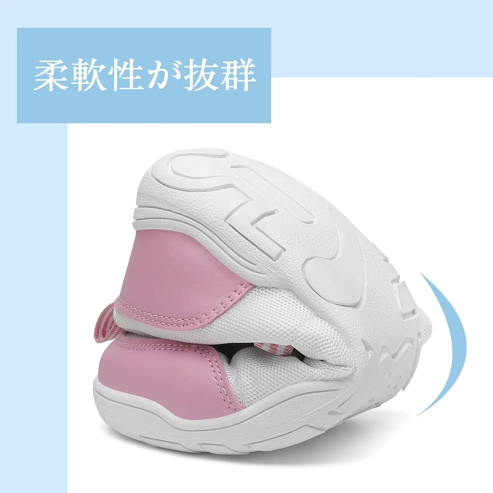 【伸縮性のあるゴム仕様】スリッポンタイプで、履き口に伸縮性のあるゴムとかかとにプルストラップを備え、簡単に脱ぎ履きができます。スポッと足が入るので、靴の履き方がまだうまくできない小さなお子様にもぴったりです。