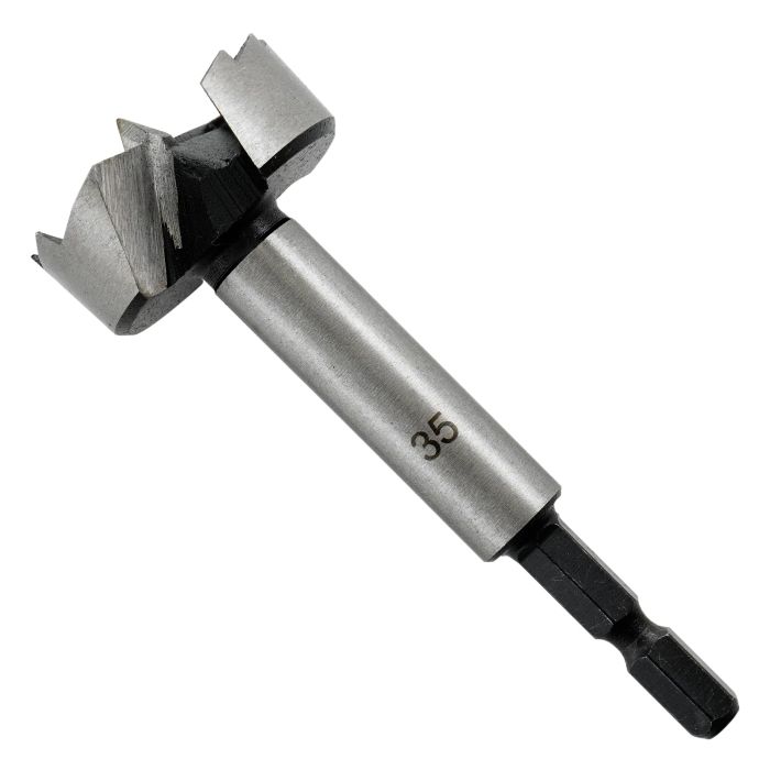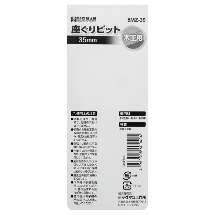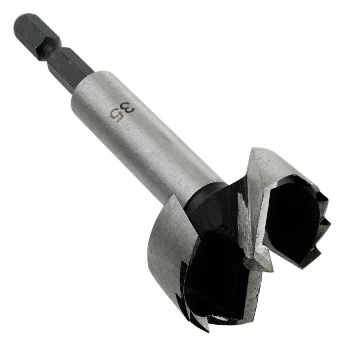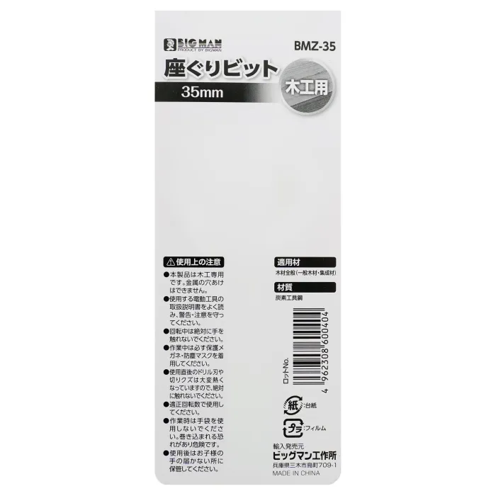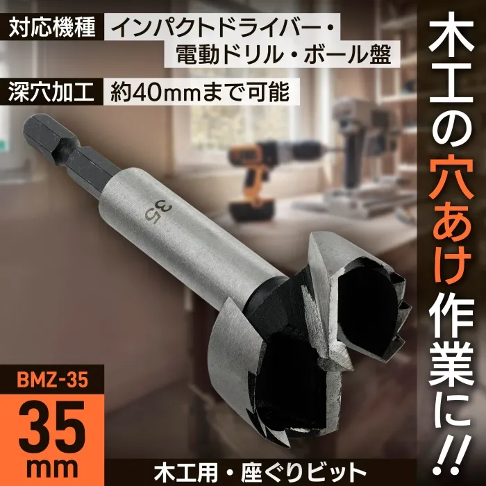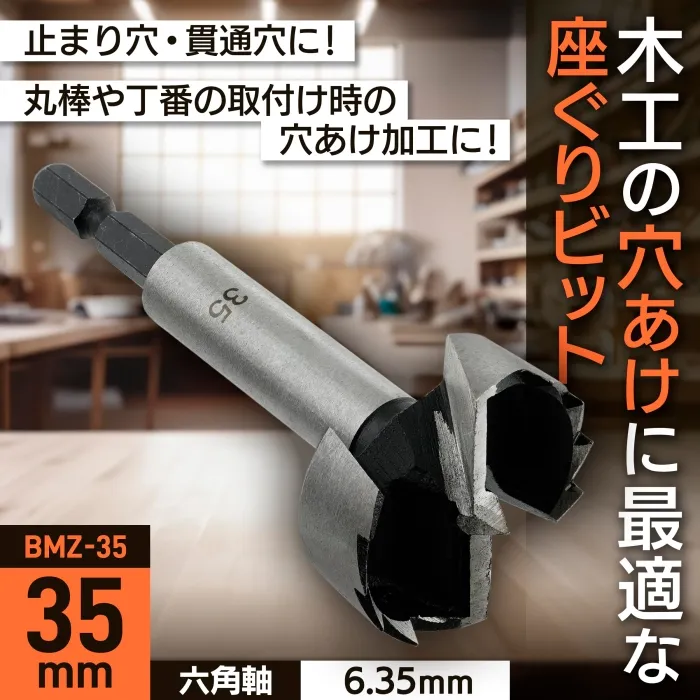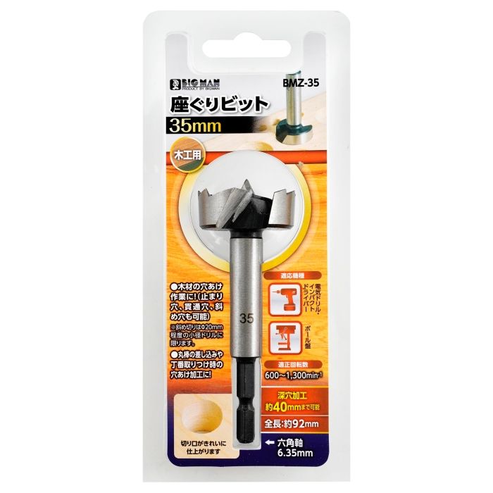 【仕様】・サイズ(mm):92×35×35・質量(g):90・穴径(mm):35・適正回転数:600-1300min-1・深穴加工:約40mmまで可能・全長(mm):約92・軸径:六角軸6.35mm・適応材:木材全般(一般木材・集成材)・材質:炭素工具鋼・適応機種:電気ドリル・インパクトドライバー・ボール盤・タイプ:木工用