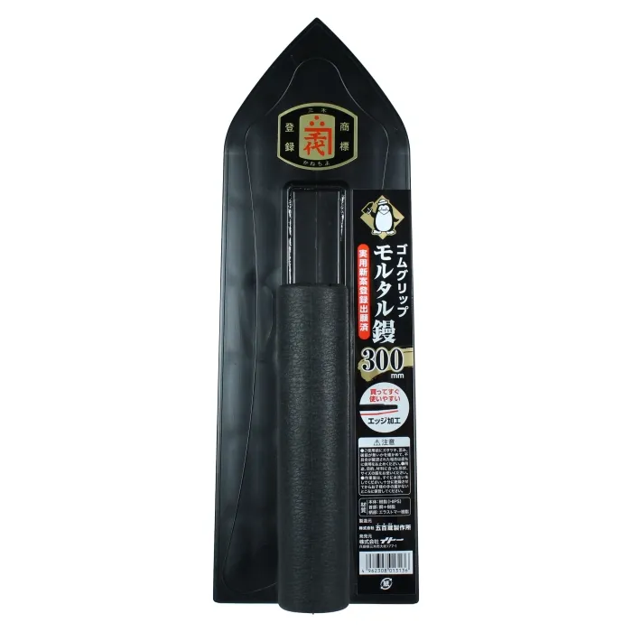 【特長】 職人さんの意見を元に開発 作業性に優れたモルタル鏝です。 滑りにくいゴムグリップ製。 長年使い込むことによって実現する塗りやすいエッジ角度を、最初から施しています。(実用新案出願済)買ってすぐに使いやすい1本です。 従来品より溝幅が広い、独自の新形状溝を採用しています。これにより、職人様によって好みの分かれる