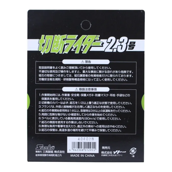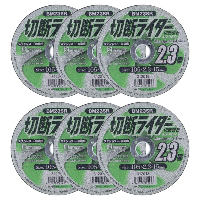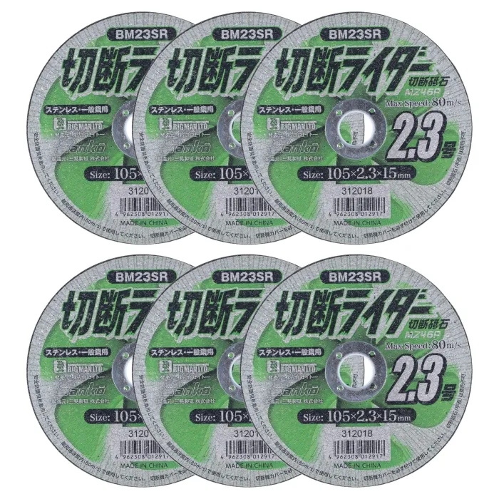 【仕様】・外径:105mm・厚さ:2.3mm・穴径:15mm・砥材:MZ・粒度:46・硬度:P・最高周速度:80m/s・最高使用回転数:14558min-1・入数:6枚・切断機のカバーは必ず砥石を1/2以上覆う適正な状態で使用してください。フランジは、外径と接触幅が左右等しく適正な物を使用してください。砥石の作業開始使用時は1分以上、取り換えは3分以上の試運転を行ってください。最高周速度内で使用してください。