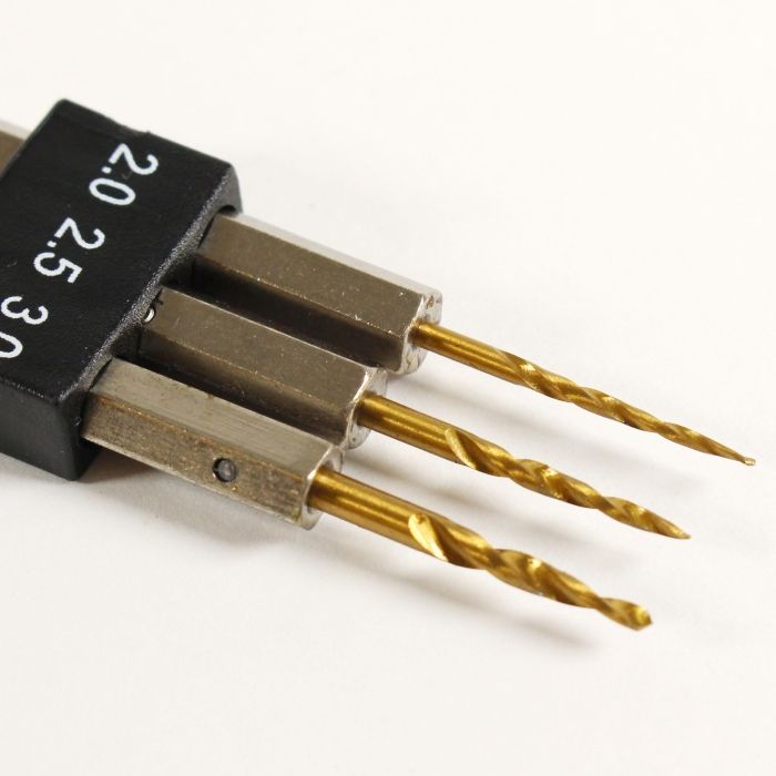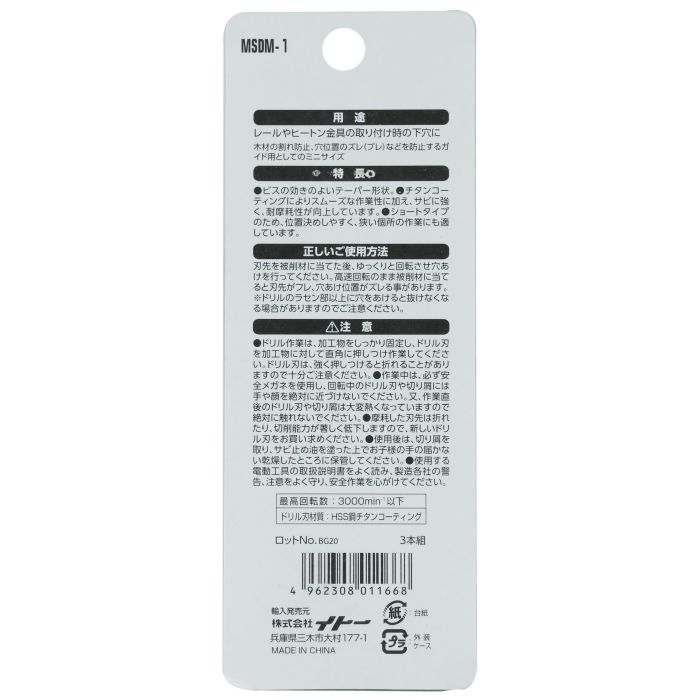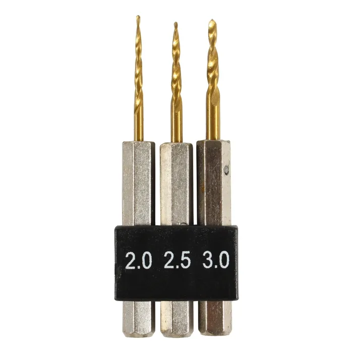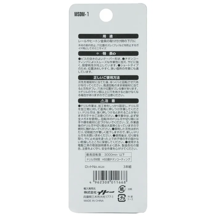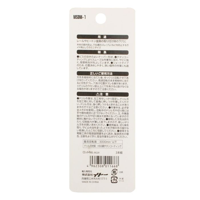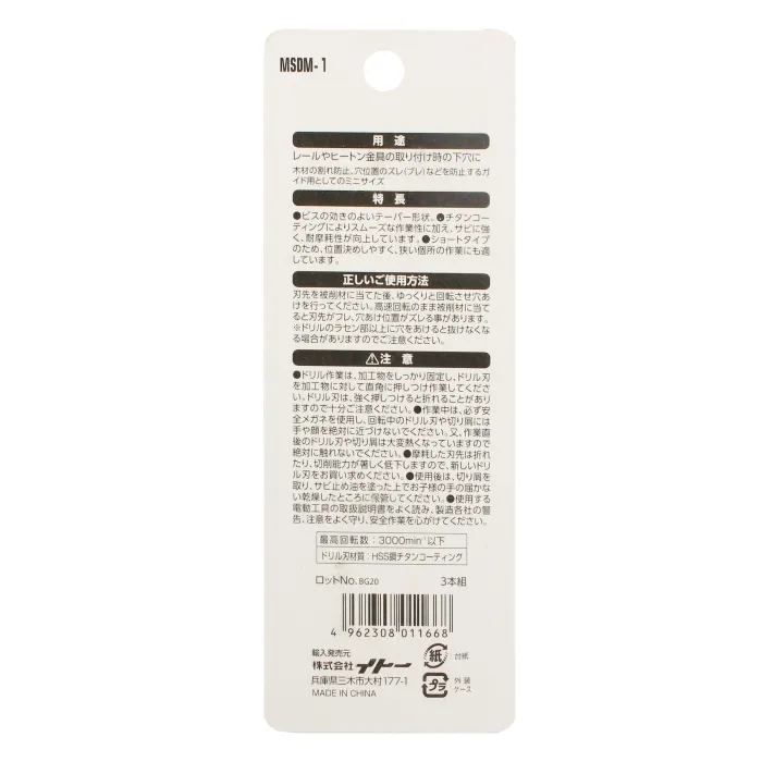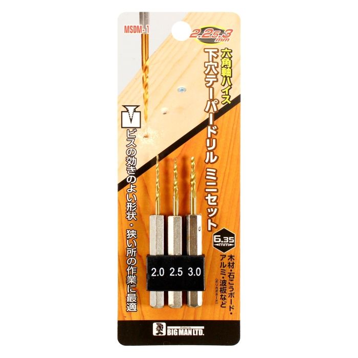 【仕様】・1本サイズ(mm):65×6.35×6.35・1本質量(g):10・軸径(mm):6.35(六角軸)・材質:HSS鋼チタンコーティング(ドリル刃)・最高回転数:3000min-1以下・対応材:木材・石こうボード・アルミ・波板な・ポリカボネードなど。・セット内容(mm):2・2.5・3(穴径)・入数:3本入・タイプ:下穴テーパードリル