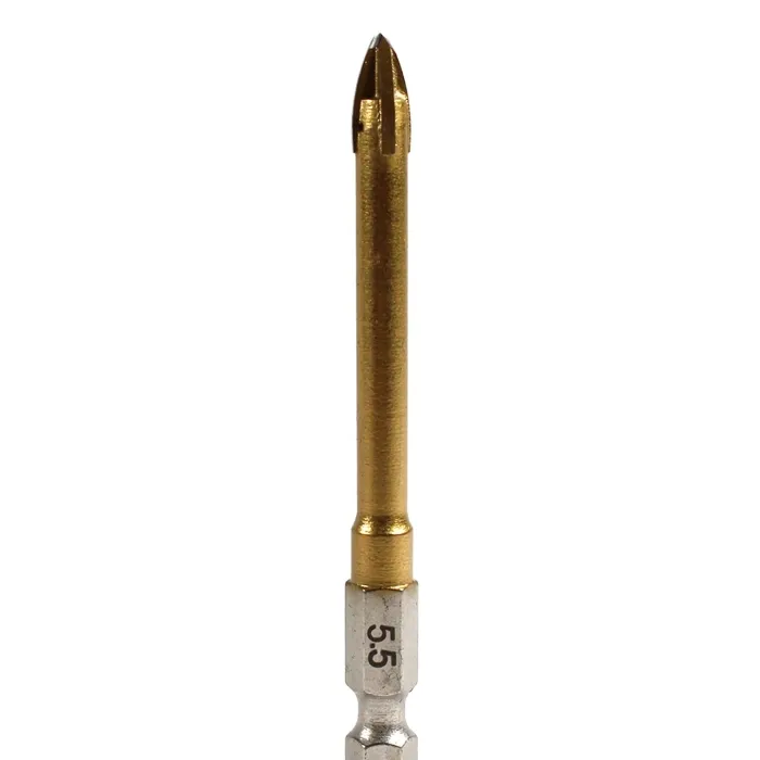 【仕様】・サイズ(mm):80×6.35×6.35・質量(g):14・材質: 本体 45C(チタンコーティング) 刃先 超硬チップ 軸 ニッケルメッキ・軸径:6.35mm(六角軸)・仕様:刃先(4枚刃)・超硬カーバイドチップ付・穴径(mm):5.5・タイプ:ガラスドリル・最高回転数(min-1):1000以下