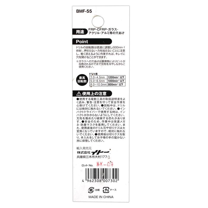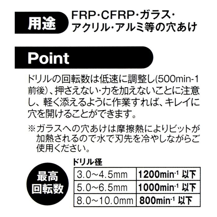 【用途】ガラス・FRP・CFRP(カーボンスチール)アクリル・アルミ等の穴あけ加工など。.