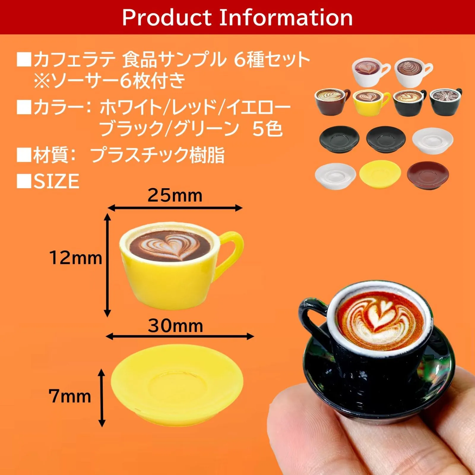 カフェラテ模型は耐久性に優れたプラスチック樹脂製です。カップと同じカラーのソーサーを6枚付属しております。カップとソーサーは一体型ではありませんので、よりリアリティがあります。
