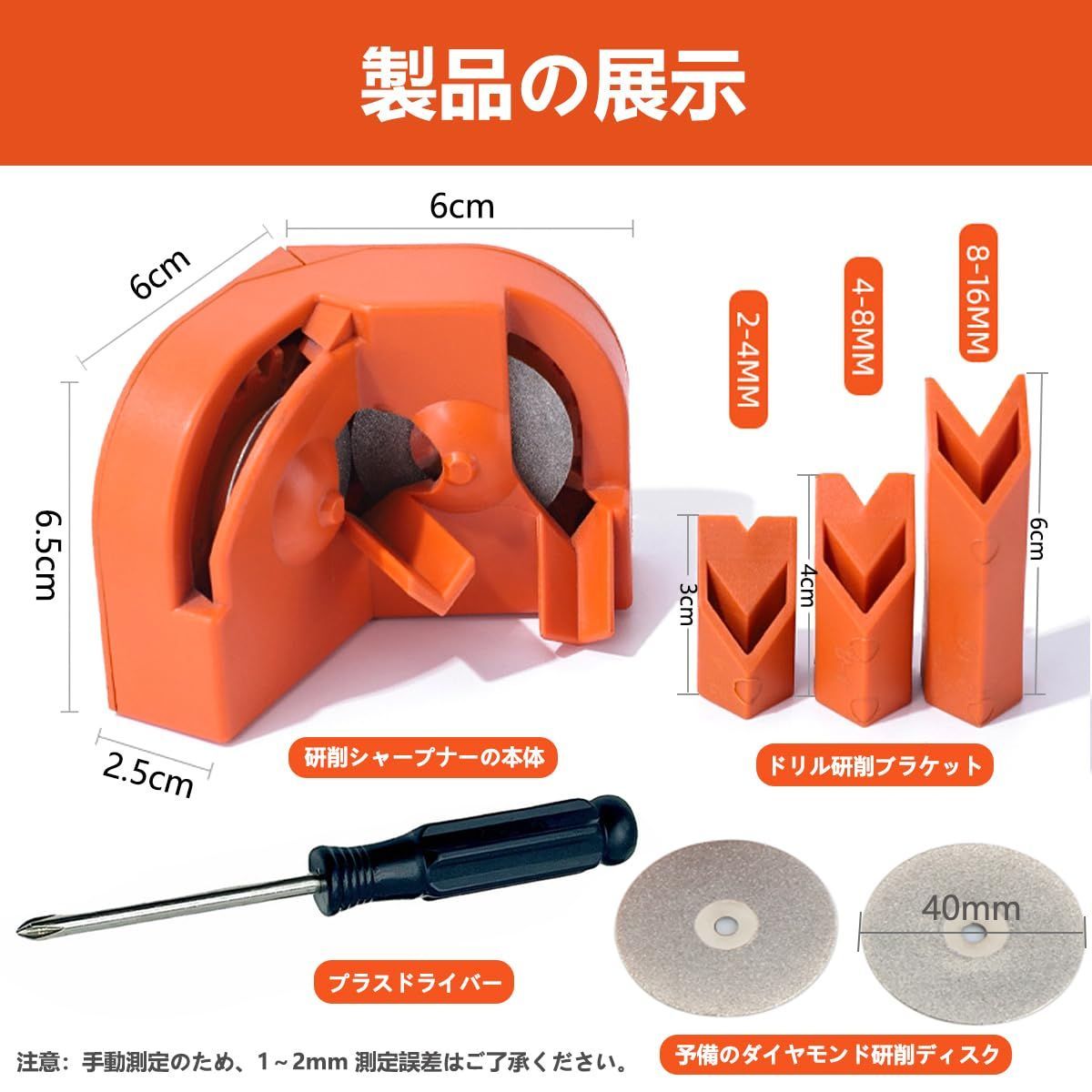 付属品:本体、ダイヤモンド研削ディスク(直径40mm)2枚、プラスドライバー1本、研削ブラケット3種類を同梱