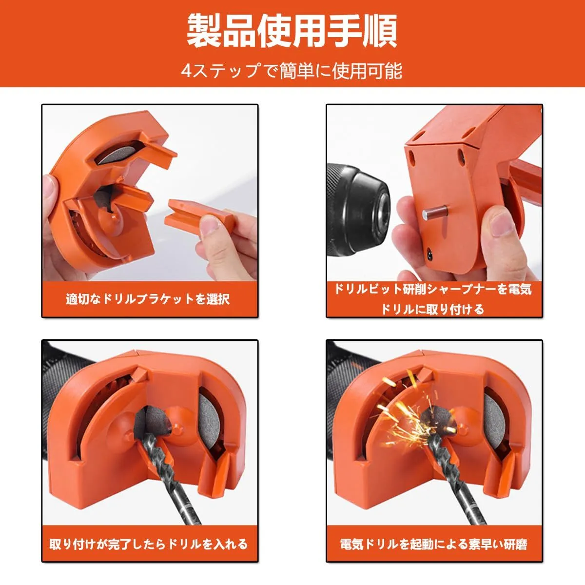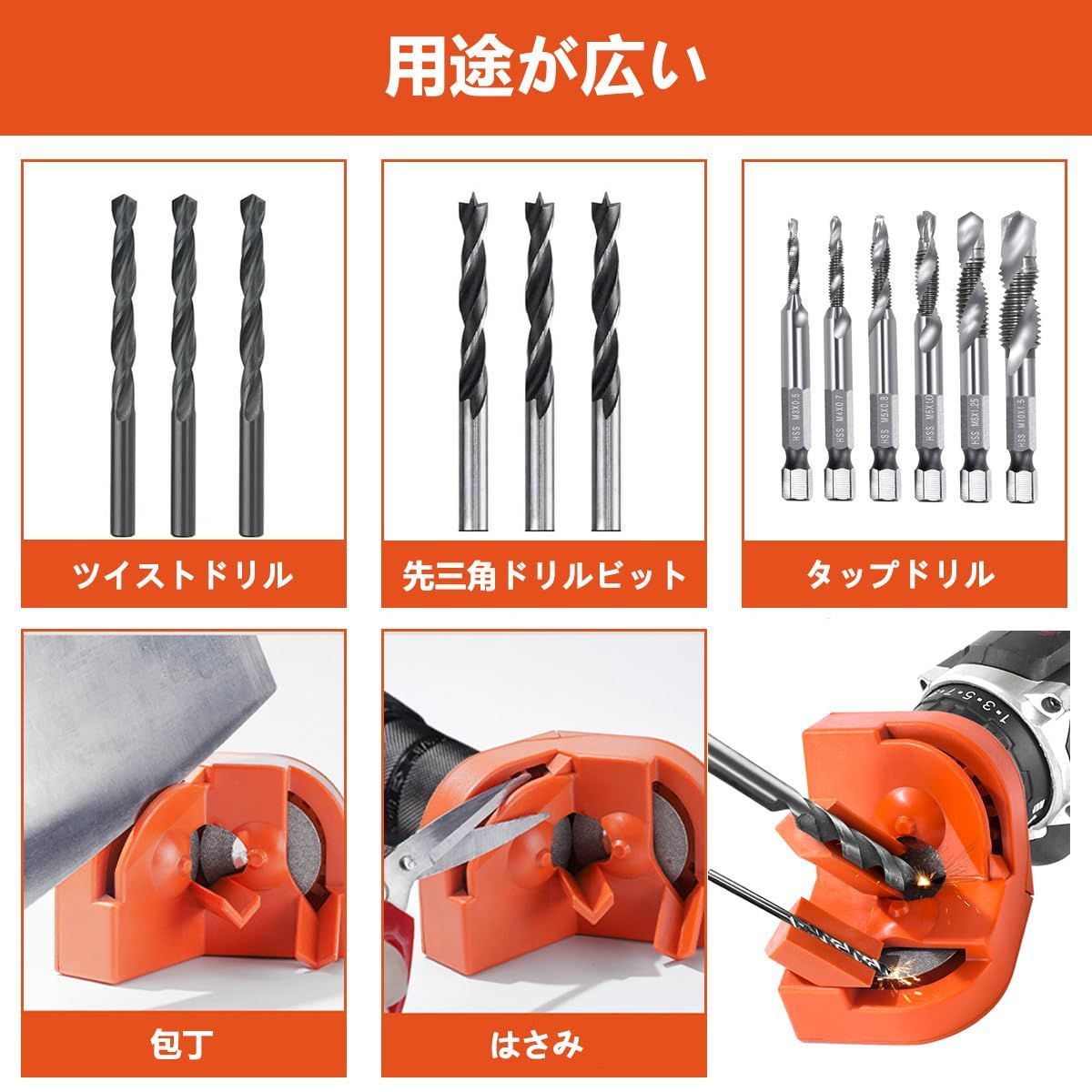 多機能性:この電動ドリルビット研削シャープナーは、2.0~16mmの範囲のドリルビットを研磨できます。電気ドリルを動力源とし、ツイストドリル、コバルトドリルなどの様々なドリルビットに適しています。 包丁や包丁の研ぎにもお使いいただけます。