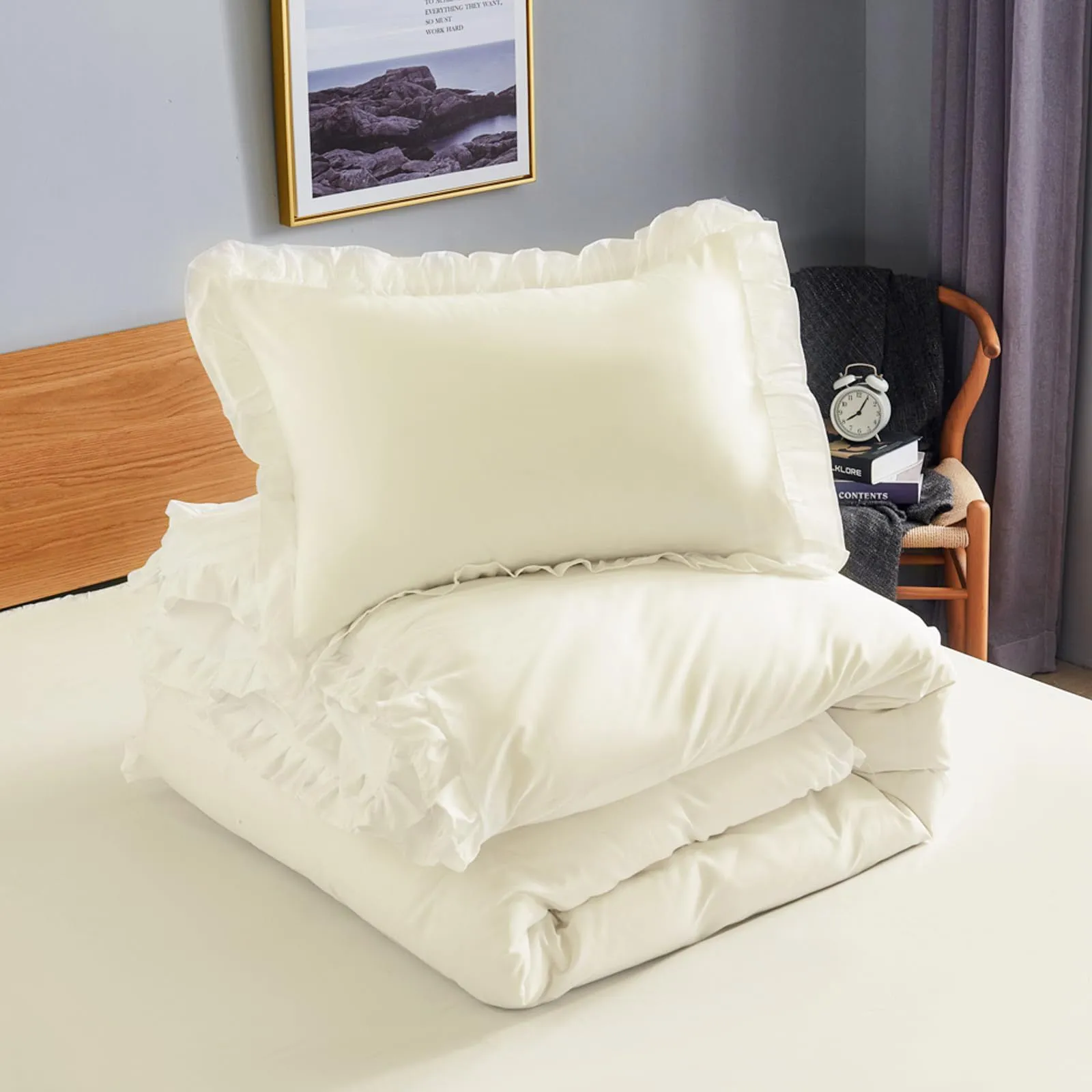 【スタイリッシュなデザイン】:掛け布団カバーと枕カバーは可愛いフリルが付いています。無地で色は派手すぎずにどんなインテリアにもピッタリと雰囲気を合わせます。体に溜まった疲れをちゃんと取れて心が癒されるようなリラックス感を感じさせます。