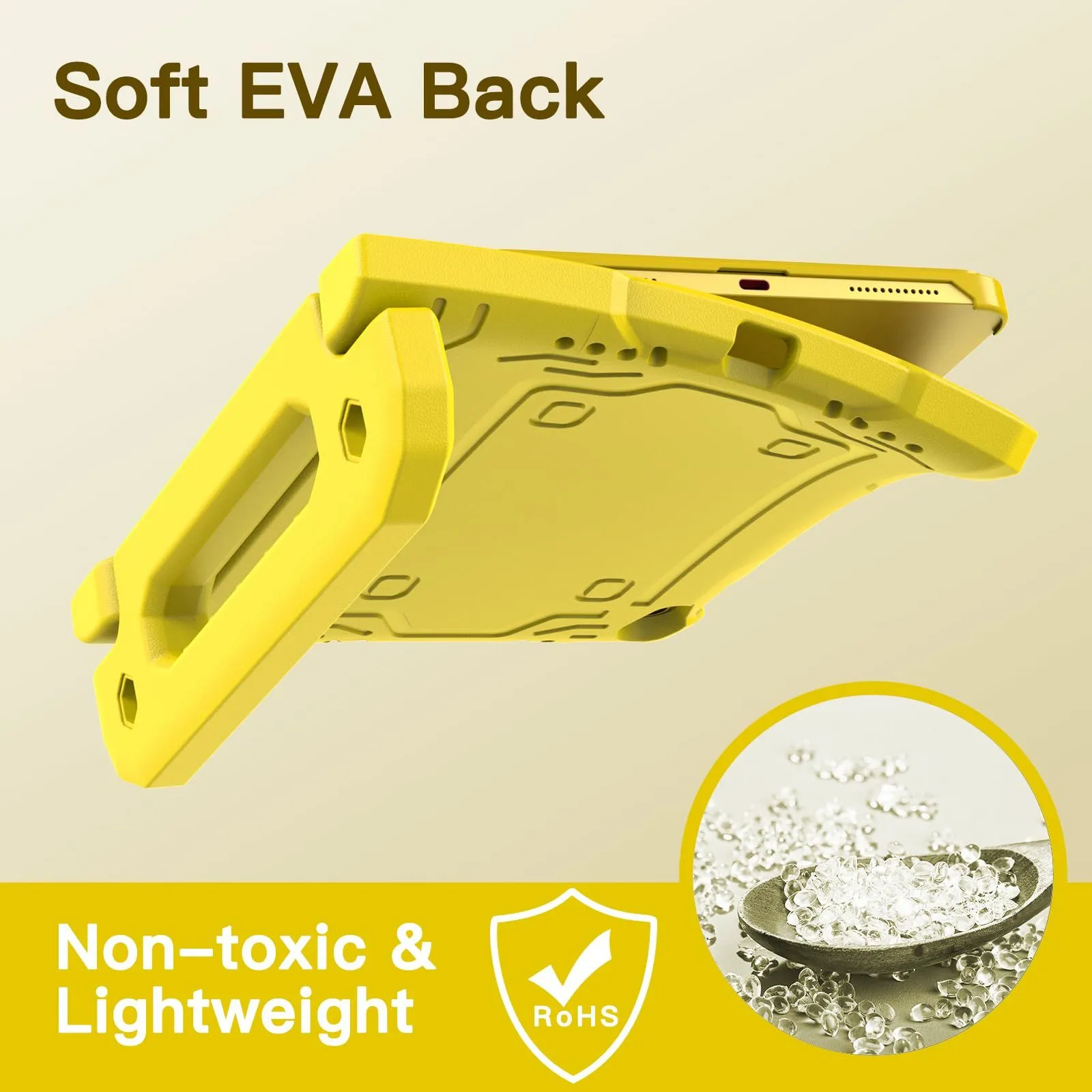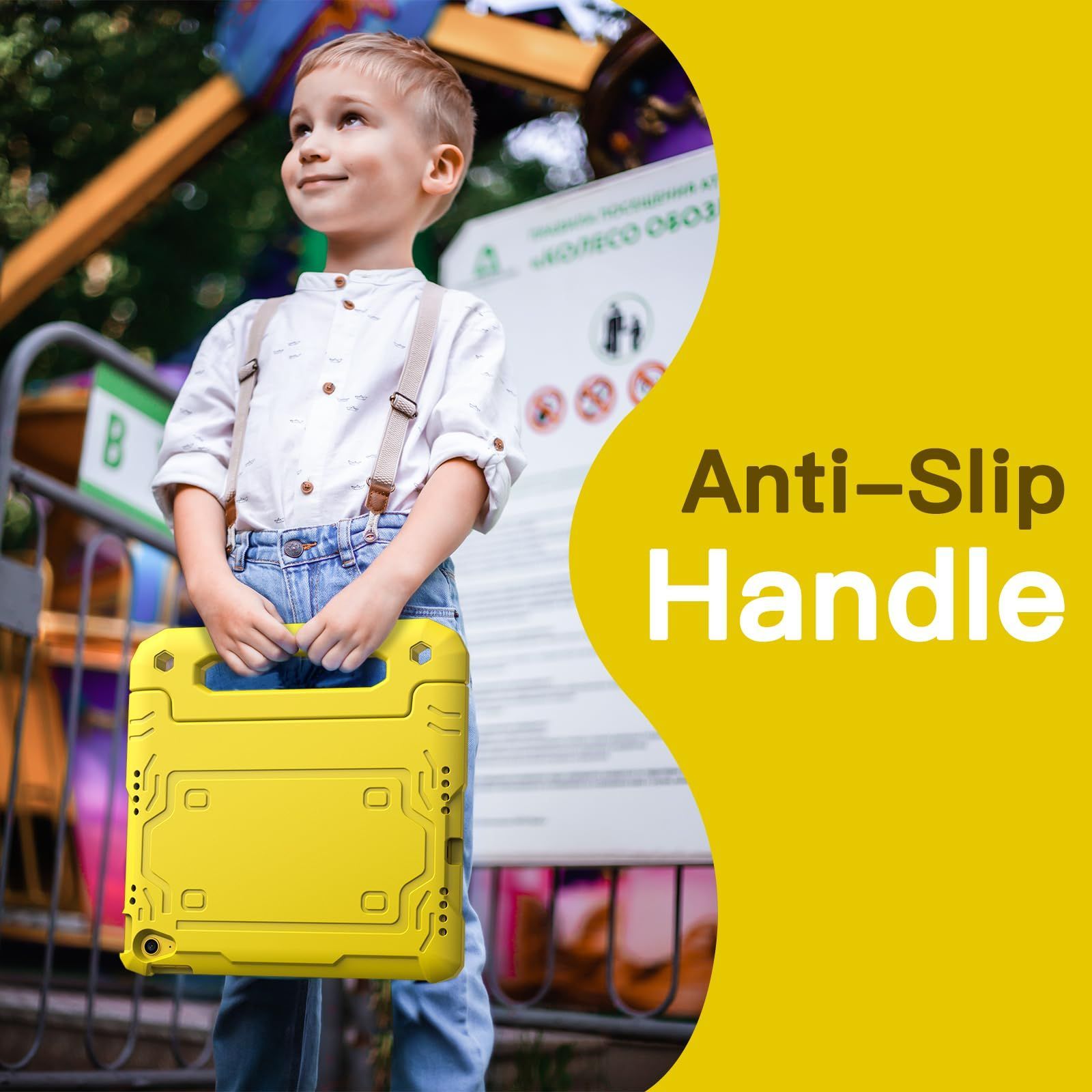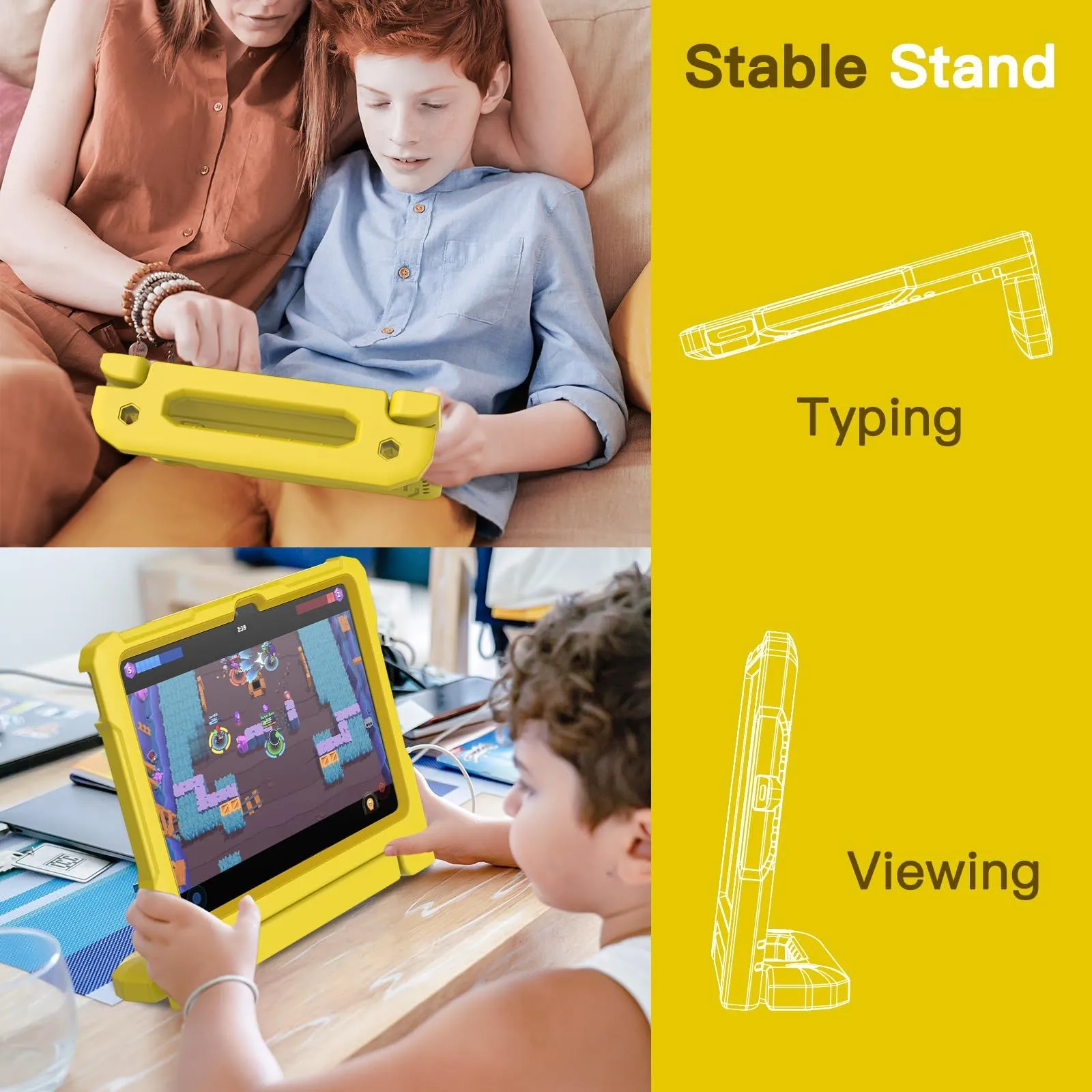 [多目的スタンド] 滑り止めの風合いで子供に優しいハンドルのデザインです。持ち?びやすいし、両手を解放して自由に視聴を体験するあるいは快適なタイピングのために折りたたんで、頑丈なスタンドに変えるのも易しいことです