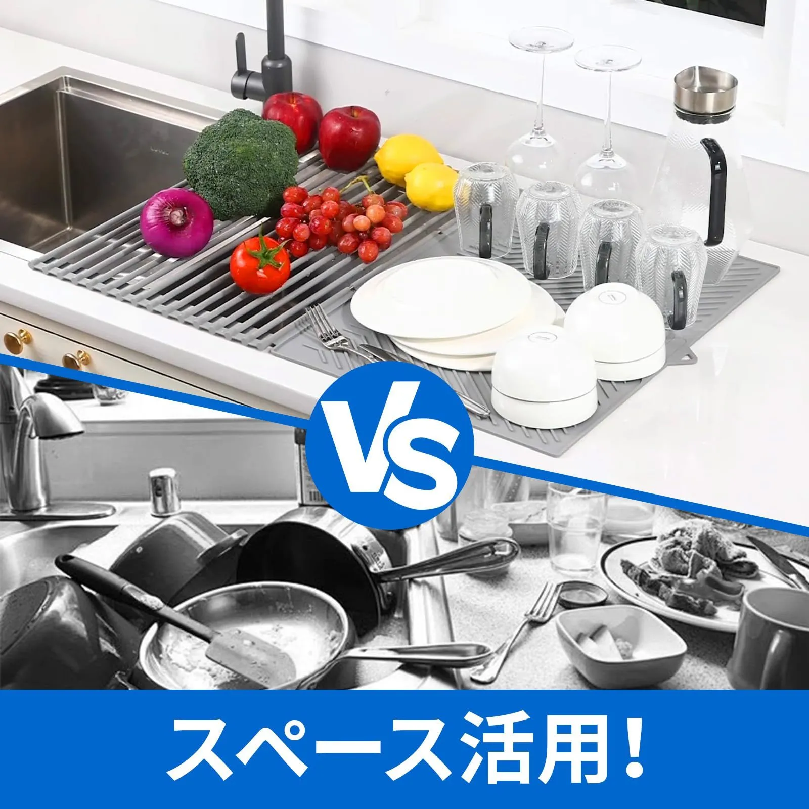 【組み合わせデザイン、広い使用スペース】小型サイズ:長さ:61cm、幅:45.5cm。[ご購入前に必ずサイズをご確認ください]。使用スペースが広がり、キッチン周りのスペースを有効活用できます。食器だけでなく、洗った野菜や調理中の食材なども置くことができます。また、まな板や鍋を置くことも可能です。キッチンを清潔で整頓された状態に保つことができ、作業効率と料理体験を向上させることができます。
