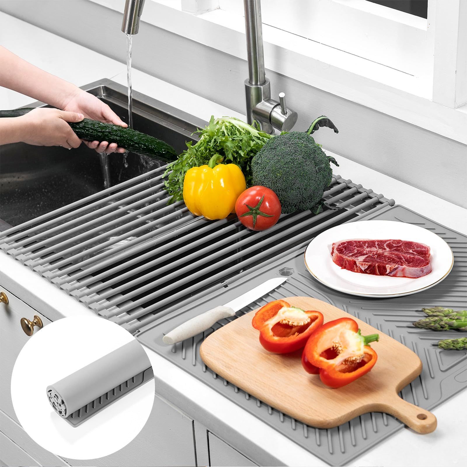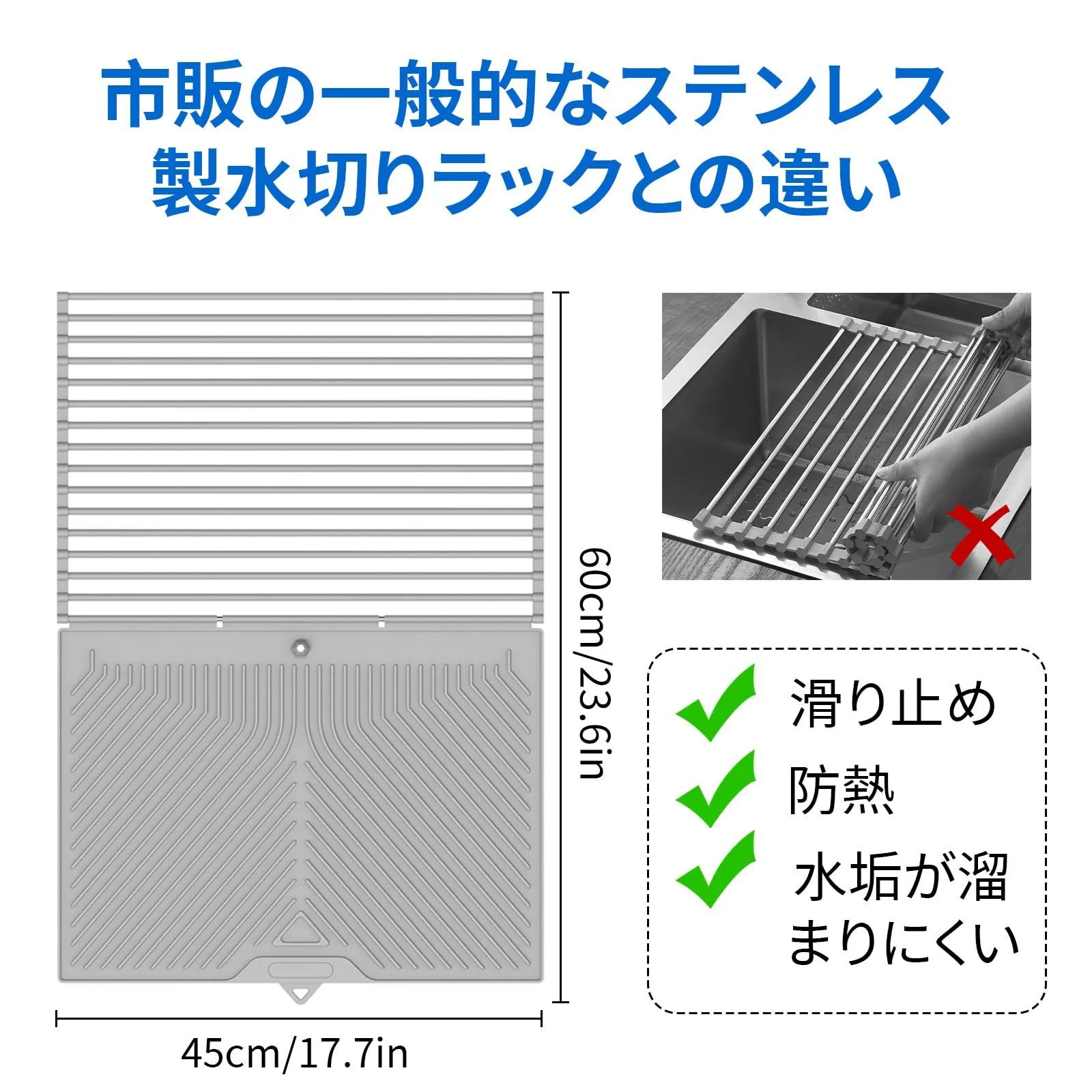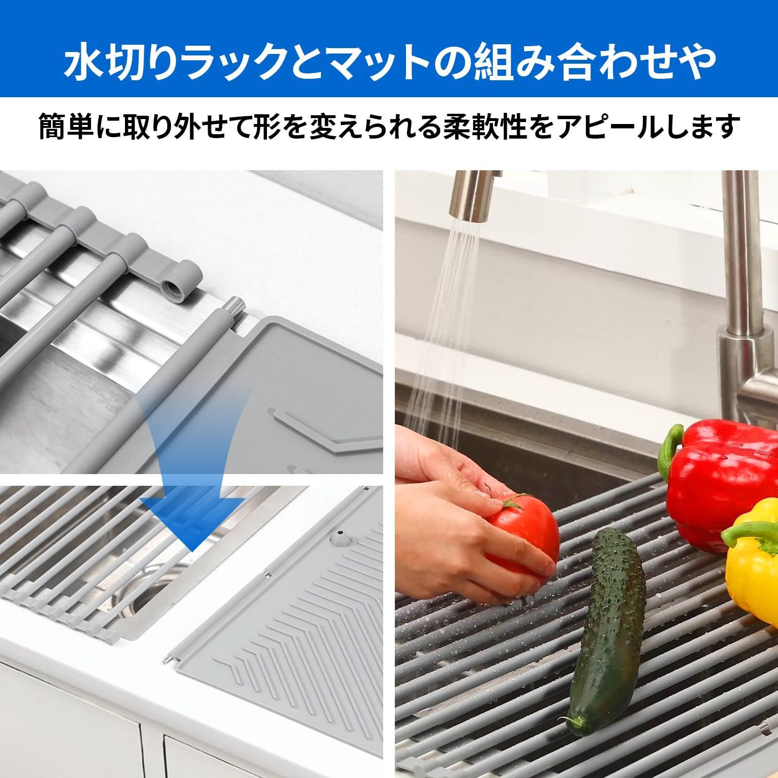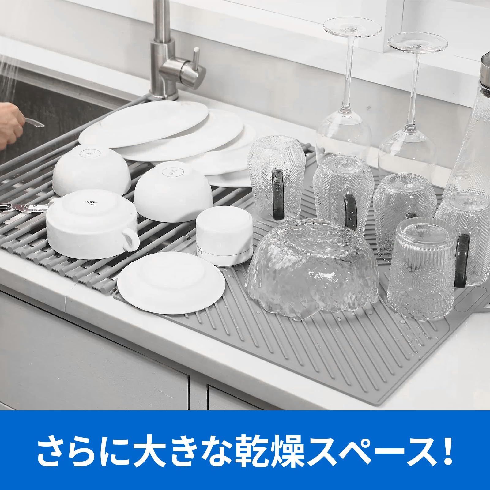 水切りラック シンク上 折りたたみ 水切りマット シリコン 食器水切り 食器置き キッチン 水切りセット 耐熱 滑り止め 錆びない 丸めて収納 省スペース(61×45.5cm グレー)