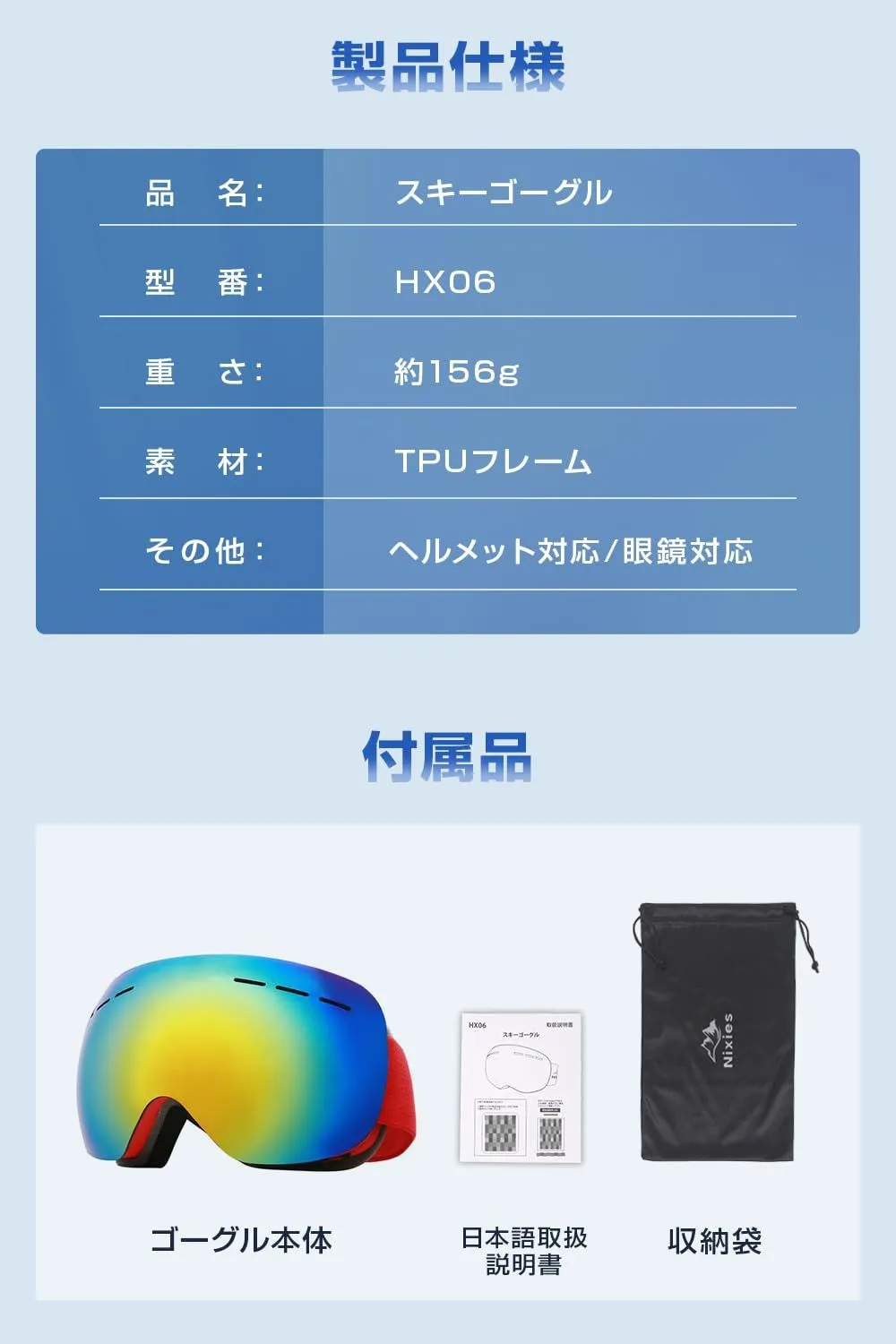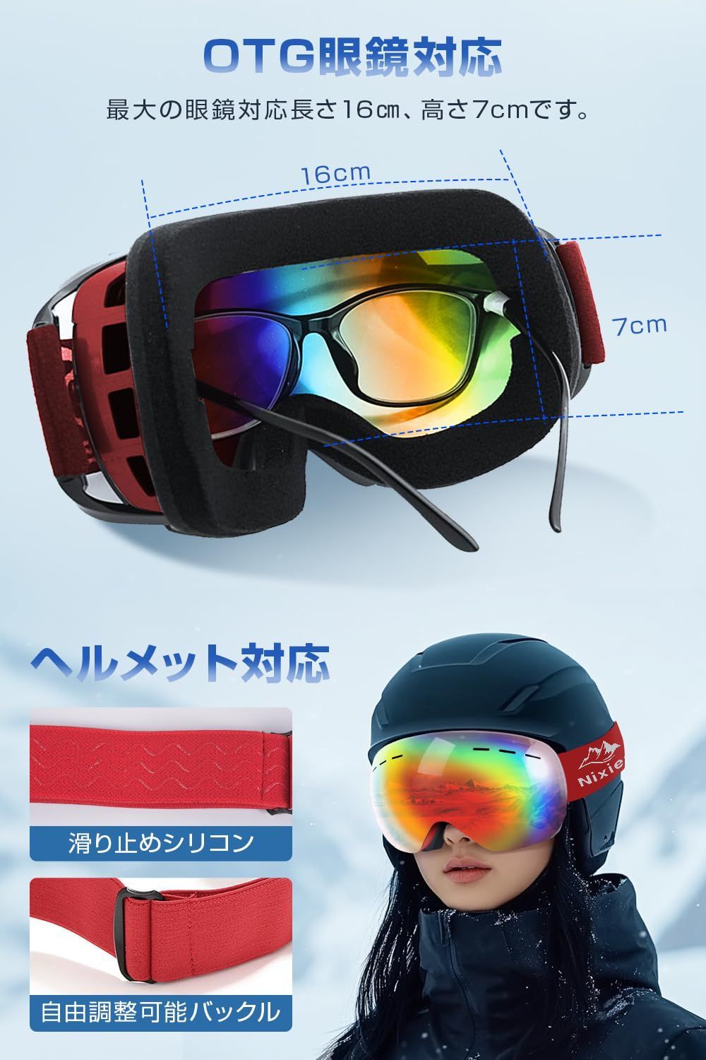 【快適なOTGデザイン&ヘルメット対応】 素晴らしい冬のスタイル!大人、男性、女性、男の子、女の子、若者向けのスキーゴーグル。 OTGデザインは、ゴーグルの上に眼鏡をかけるように特別に設計されています。さまざまなタイプのメガネに対応できるよう、レンズのサイズを拡大しました。長さ16㎝以内 の近視メガネに適しています。 ストラップは伸縮性を維持する繊維を採用し耐久性がつよいです。また、高弾性ベルトは裏面には滑り止めシリコンを採用し、ヘルメットとの相性が抜群です。ベルトはバックルが設置されており、簡単に取外しができ、長さを自由に調節することができます。