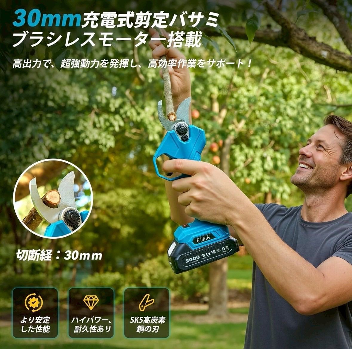 【充電式剪定ばさみ(最大30mm切断)】 ・太枝もスムーズにカット ・30mm/20mmの切断モード切替可能 ・関節への負担が少なく初心者にもおすすめ