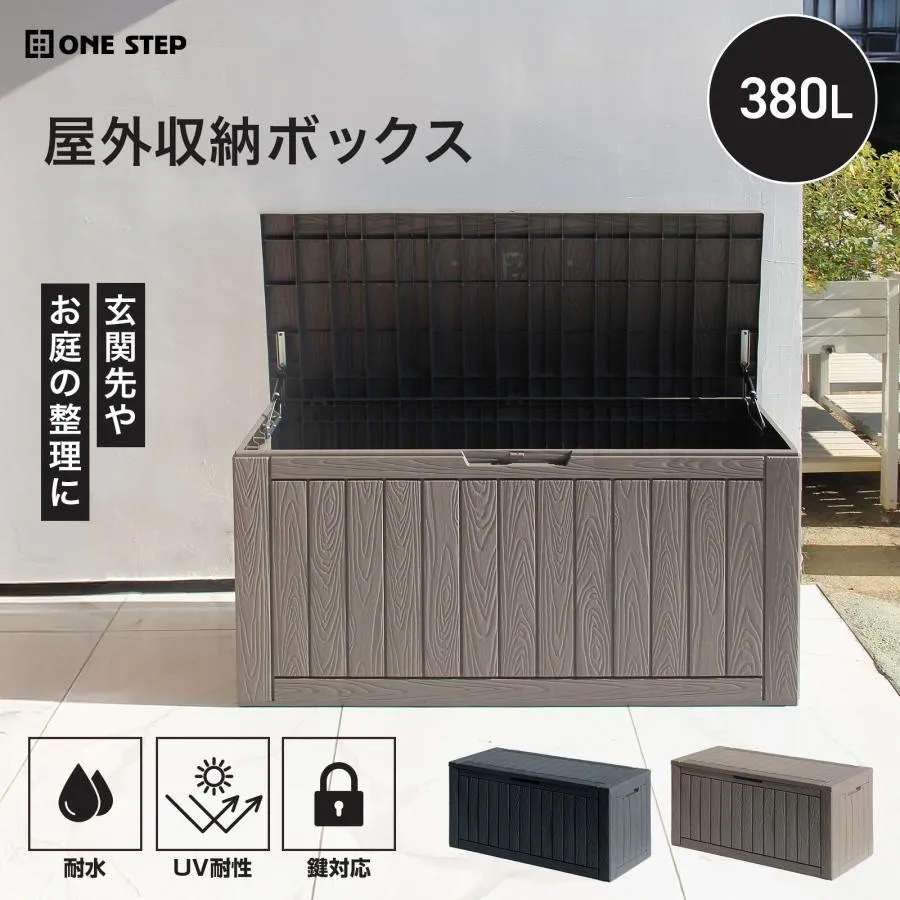 380Lの大容量でガーデニング用品やアウトドアグッズ、ポリタンク、掃除用具、防災グッズまでしっかり収まります。