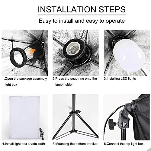 【セット内容】2 xソフトボックス、2 x三脚スタンド、3x58WLED電球、1x収納バッグ、1x説明書付き。ソフトボックスの本体は簡単に組み立て、収納袋が付属してどこでも持ち運びやすいです。収納完了でもコンパクトでどこでも持ち運びやすいです。