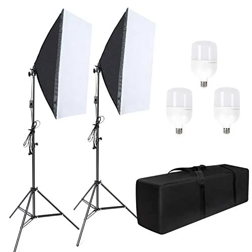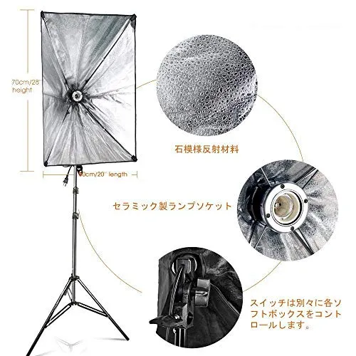 ソフトボックス 50x70 cm 写真撮影照明用キット 58W 5500K LED電球 2M三脚ライトスタンド アルミ製 スタジオソフトボックス キャリングバッグ付き 国内発送