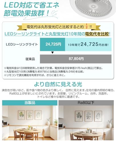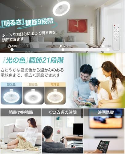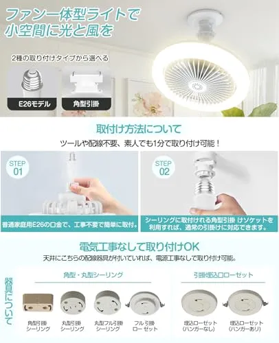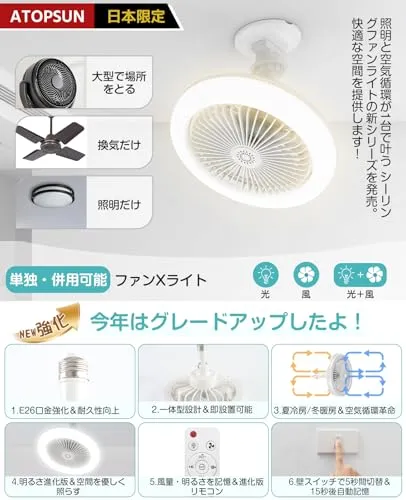 【壁スイッチのメモリー・省エネ】ATOPSUN シーリングファンライト ファン付き照明 LED シーリングファン 小型 扇風機 天井 24W 100W相当 2000LM E26口金 DCモーター 無階段調色調光 3段階風量調整 タイマー機能 6畳小型 天井照明 小型 軽量 簡単取り付け 工事不要 説明書付き (リモコン・天井の引っ掛け付き) 国内発送 安心してご購入いただけるよう、丁寧な対応と梱包を心がけております。 風と光が見事に調和&全年用サーキュレーター:2026年進化版のシーリングファンライトは「風と光の永遠のハーモニー」を設計哲学に、冬は室内の温度差を解消し温もりを届け、夏は清涼感あふれる循環気流をもたらし、季節を問わず年中快適な空間を実現しました。ファン付き照明は独自の羽根とLEDシーリングライトが見事に融合し、稼働時も静謐で優雅な雰囲気を醸し出します。リモコン操作に対応し、家族の生活リズムに合わせて風量・明るさ・タイマー機能などを自在に調節可能。シンプルでモダンなデザインと高いお手入れ性能を両立させ、空間の隅々まで風と光が見事に調和し、全く新しい快適体験をご提供します。 正逆転機能で一年中快適&アロマの香りを楽しむ&:シーリングファンは空気の流れを切り替えられる正逆転機能で、夏は爽やかな涼風で室温をよく下げ、冬は天井の暖気をよく循環させます。ファンライト 小型は脱衣所、トイレ、キッチンなどの居住空間を涼しくしたり、温かくしたり快適なものにします。また、アロマ機能も搭載しており、お好きな香りを風に乗せてリラックス空間を演出します。※アロマタンク: アロマタブレットに入れて使えます(付属なし) 無階段調光調色&3段階風速調節&タイマーメモリー機能:シーリングファンライト E26は昼白色、昼光色、電球色が3つ色温度を無段階で調節可能、高品質LED光源を搭載して、無死角発光を実現しました。リビングや脱衣所では昼白色、和室や寝室では電球色など、利用シーンに合わせた色が選べます。ファン付きシーリングライト ledは「弱」、「中」、「強」の3段階の風量調整モードを備えていますが、森の中にいるような自然でやさしい風が体を包み込み、夏の暑さを忘れさせてくれ、心も体もリフレッシュできます。また、「1H」「2H」「4H」3つの時間帯スイッチを押すと