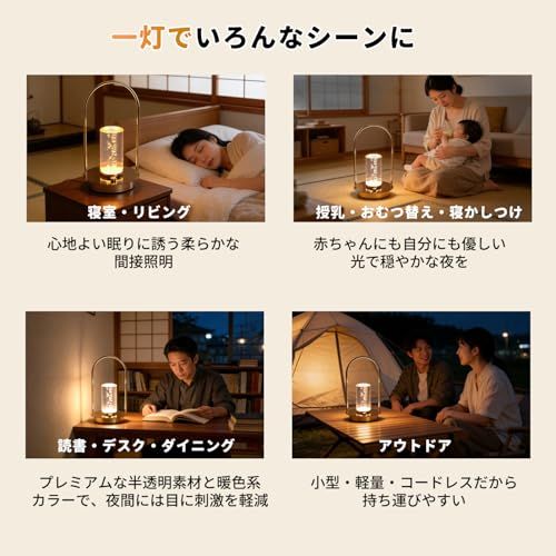【均一な明るさ&面発光】 面発光設計により、光をムラなく均一に拡散。360どこから見ても快適な明るさです。 おやすみモード:明るさを落とせば、やさしい常夜灯として就寝時に活躍 リビングの雰囲気照明:ソファサイドに置いて、部屋全体をほどよく照らす多灯照明の一台に おもてなし玄関灯:玄関のチェアサイドに置けば