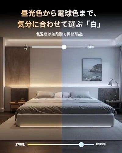 【より自然な白色光を、独立LEDチップで】独立したホワイトLEDチップ搭載で、ムラなく自然な「白」を実現。 1%刻みの明るさ調整と、2700~6500Kの色温度切替で、日光のようなクリアな光から、電球のようなやわらかい灯りまで幅広く対応。仕事や読書、リラックスタイムまで、シーンに合わせて最適なあかりをお選びいただけます。