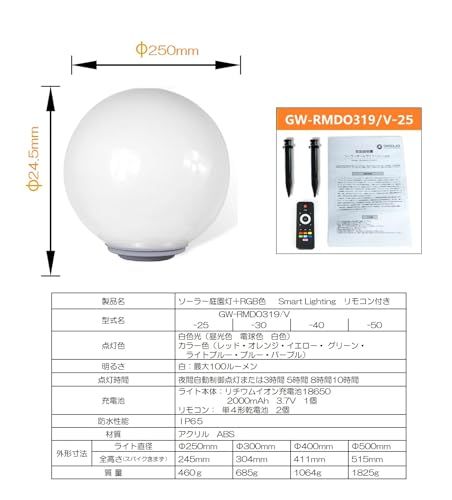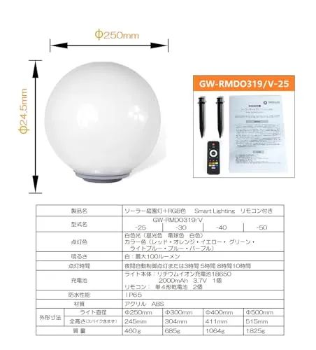 【商品仕様】直径25ボール 内蔵:単結晶ソーラーパネル、LED:ホワイト色・電球色、RGB、充電池、防水:IP65、付属品:リモコン、差し込みアンカー2本、質量:約460g、材質:PMMA、ABS