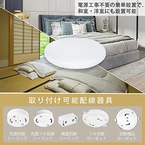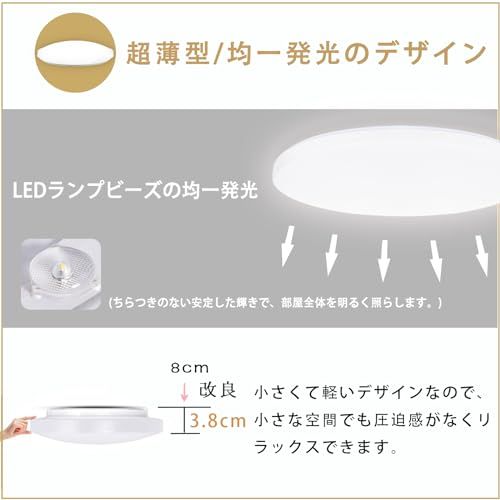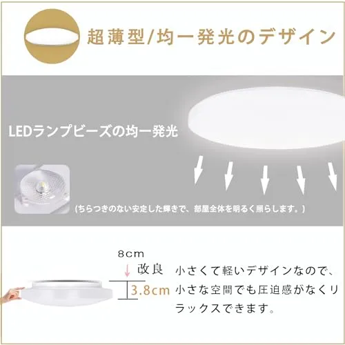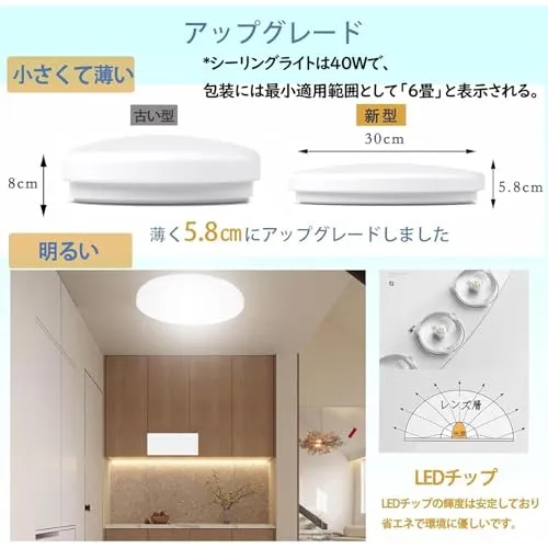 【薄型、小型設計&取り付けが簡単】より薄くて軽い質感をお届けするため、当社の工場では厚さを従来の8cmから3.8cmに改良しました。ライトの重さも0.5kgになり、引っ越しにも簡単に持ち運べます。装着説明書が付属しており、4ステップで簡単に装着でき、ライトから直接交換できるので、女性でも簡単に操作できます。*この天井灯(シーリングライト)は45Wで、適用範囲は610畳、包装には最小適用範囲として「6畳」と表示されています。