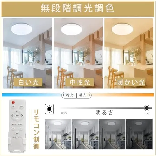 【高輝度&無段階調光調色】2025年最新型LEDチップを採用し、4950lmの高輝度で部屋の隅々まで明るく照らします。2.4GHzリモコンによる繊細なコントロール、光の明るさと色温度のステージフリー調整、明るさ10100%無段階調整、色温度2700k7000k調整。(暖色系から昼光色まで)