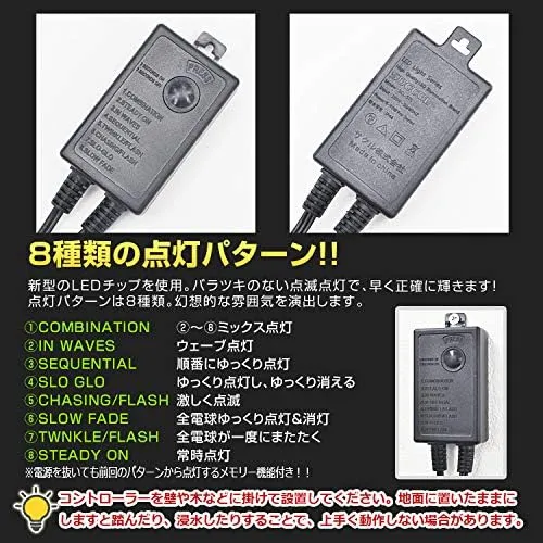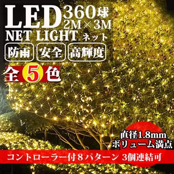 【電気安全法PSE適合品(経済産業省に事業届出提出済み)正規メーカー品】イルミネーションネットライト 定番商品 LED数360球 2M3M 線径1.8mm 連結コネクター付 1000球まで連結可能。8つの点灯パターン メモリー記憶付き(コンセント抜いても再度差込むと同じ点灯パターンになるので再設定の手間がかかりません。)