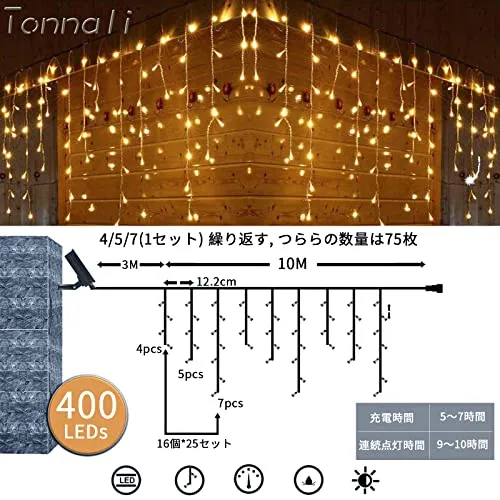 「屋内外使える多用途イルミネーションライト」400球 10M つららライトは400高輝度LED電球がつらら状に垂れ下がり真冬の氷柱が輝いているような演出、電飾ケーブル長さ: 約10m ;電源コード長さ:約3m;LED配列: 4-5-7, 75列 ; 電球数:400球;コード間隔:12cm;発光色:ホワイト;十分な長さで3種類取り付け方式より自由に飾って,、ベランダ・バルコニー・フェンス・屋根の軒,店舗のデコレーションなどから垂らすだけで、暖かい雰囲気が作ります。