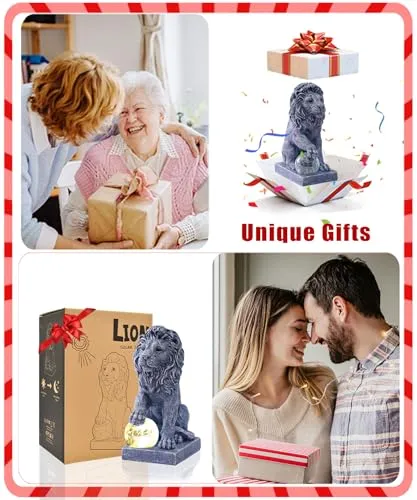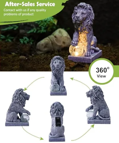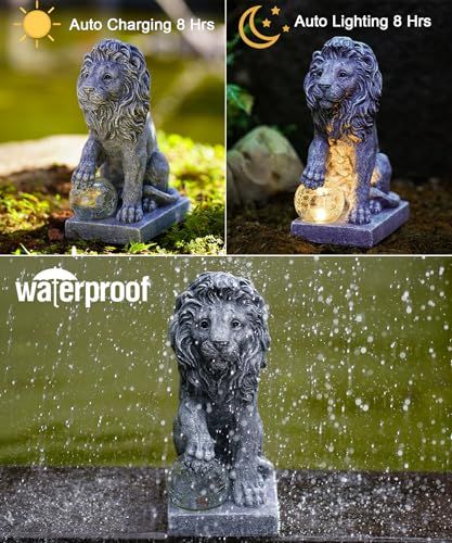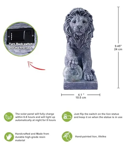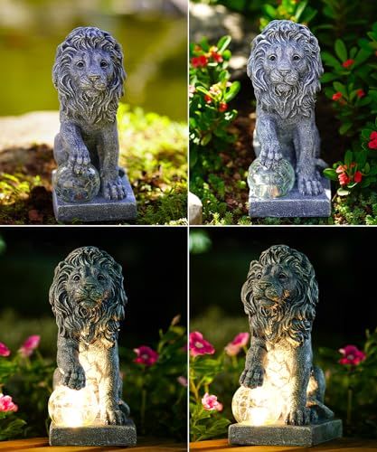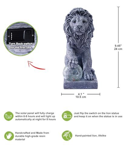Yeomoo ソーラーライト ライオン 置物 ガーデンオブジェ - 水晶玉ライト付き 防水 屋外/室内 庭 飾り 獅子 ストーングレー 樹脂製 誕生日 母の日 ギフト 女性 男性 クリスマスプレゼント 国内発送