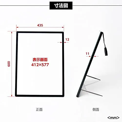 看板仕様:本体サイズ 435mm660mm 原稿サイズ A2 420mm594mm 表示画面 412mm577mm 表面照度 4500LUX 付属品 壁掛け用金具セット2br卓上用ビス2br電源コード:長さ2m (本体より)