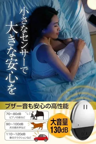 【仕様】・検知方法 振動検知式 ・電源 LR44ボタン電池3個(内蔵) ・電池寿命 約1年 ・音量 130db ・外形寸法 W51H64D9mm ・重量 本体23g ・使用範囲 屋内専用