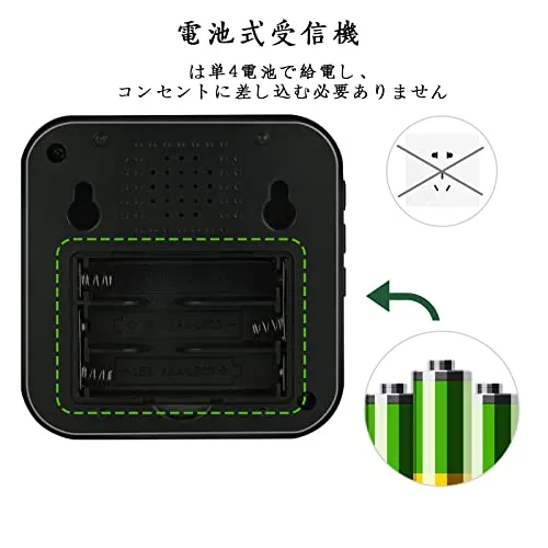 チャイム受信機は単4電池(含まれていない)で給電し、コンセントに差し込む必要ありません。