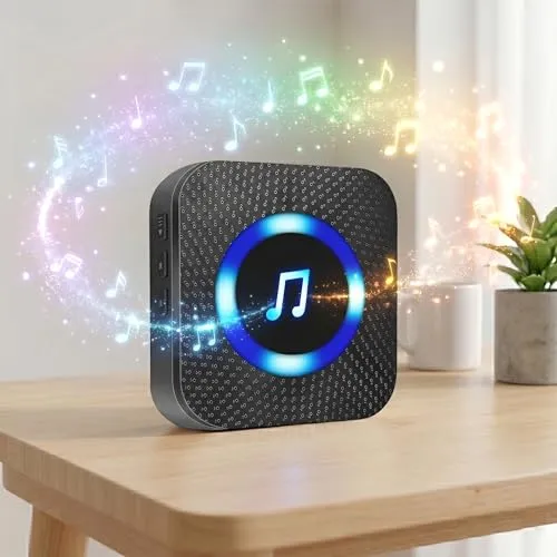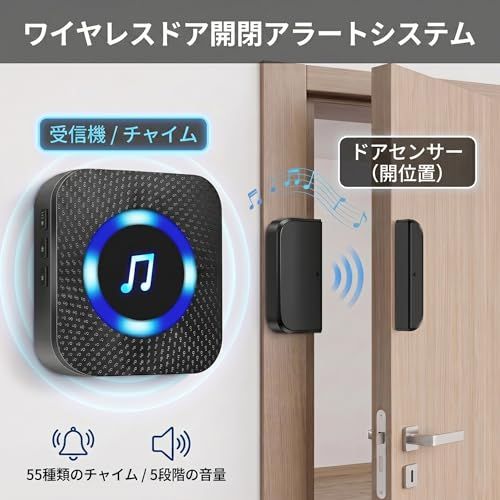 55曲、5段階音量調整、ミュートに設定できます、通信距離150メートル。受信機には5つのLEDライトがついており、ドアベルが鳴ると点灯します。