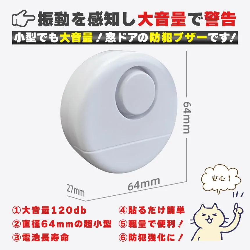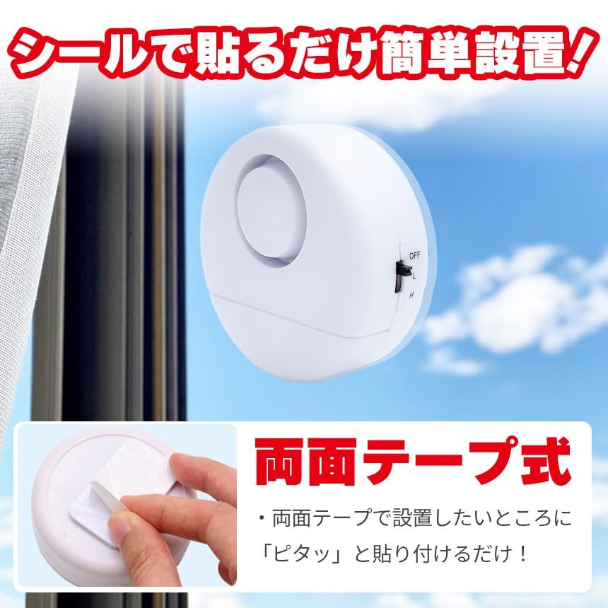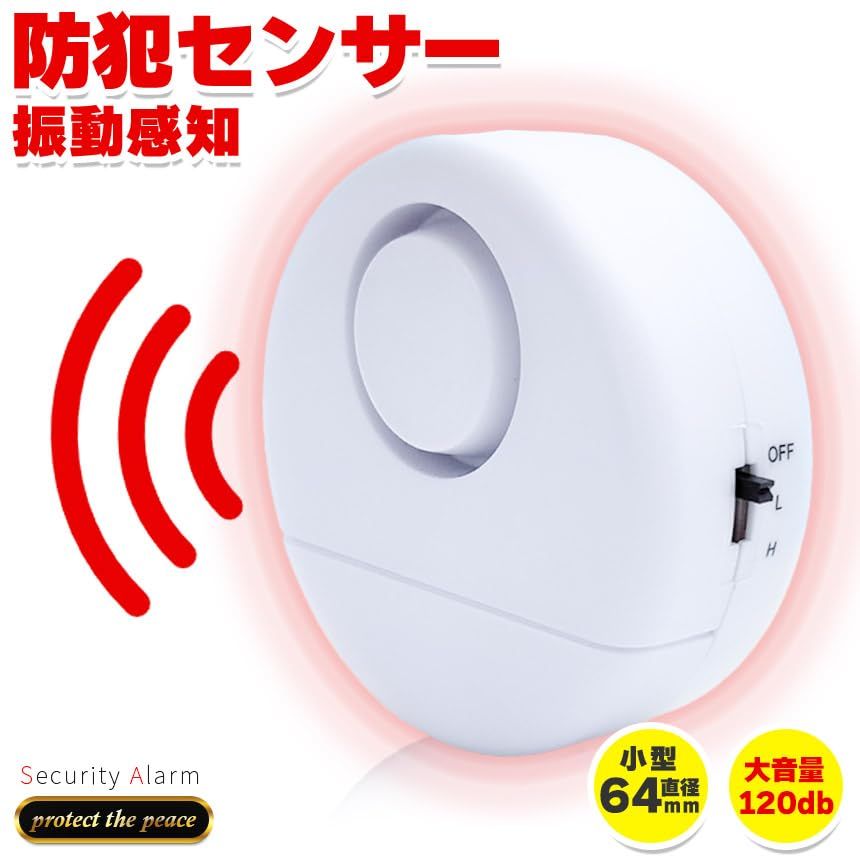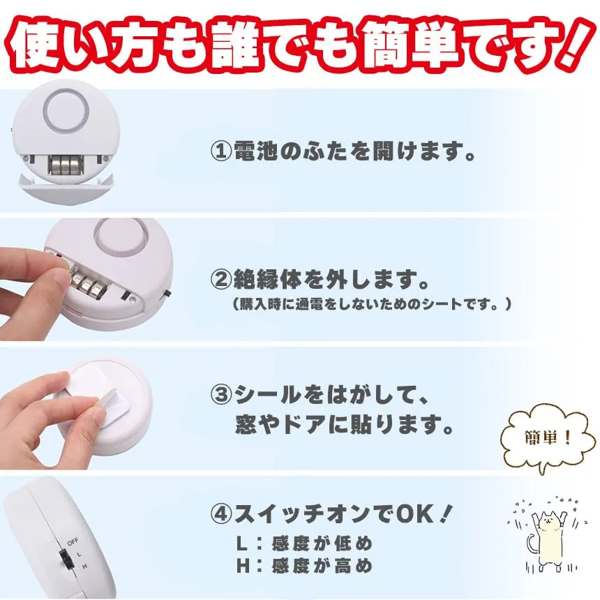【振動感知で大音量】窓やドア等に貼り付けて、振動を感知すると120dbの大音量で30秒間アラームが鳴り響きます。感度も設定できるので、風で窓がよく揺れるところなどは感度低めに等、使い勝手が良いです。基本的にはL(lowモード)がおすすめです。(※電源をいれたら12秒程度してから警戒状態に入りますので、つけた瞬間鳴ってしまうことなく安心です。)