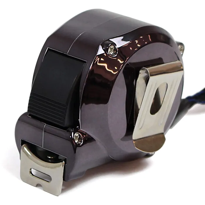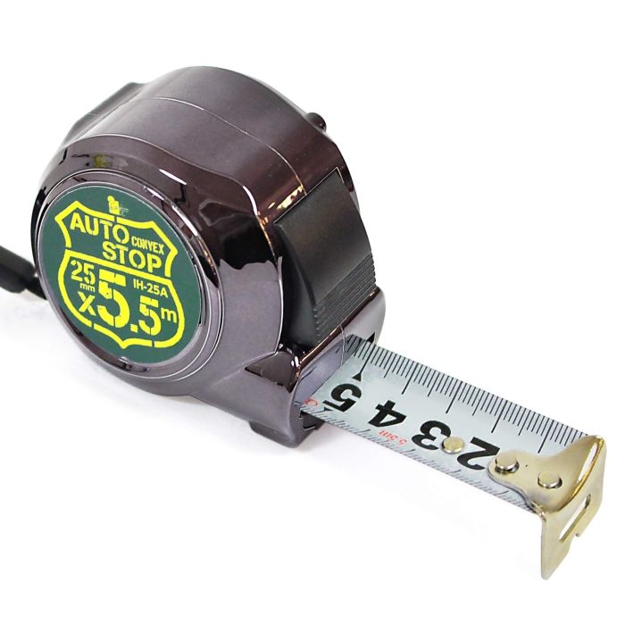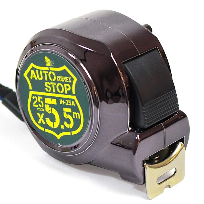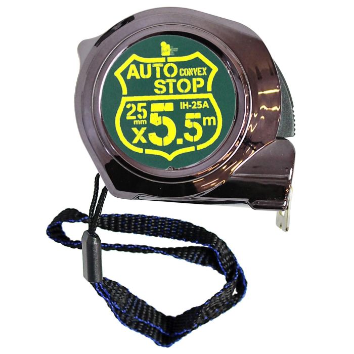 【仕様】・サイズ(mm):68×58×45・質量(g):252・テープ幅(mm):25・テープ長(m):5.5・材質: テープ スチール ボディ ABS・付属品:ストラップ・タイプ:オートストップ(ボタン解除)・仕様:スチールテープ・ナイロンコート・カラー:ブラックガンメタ