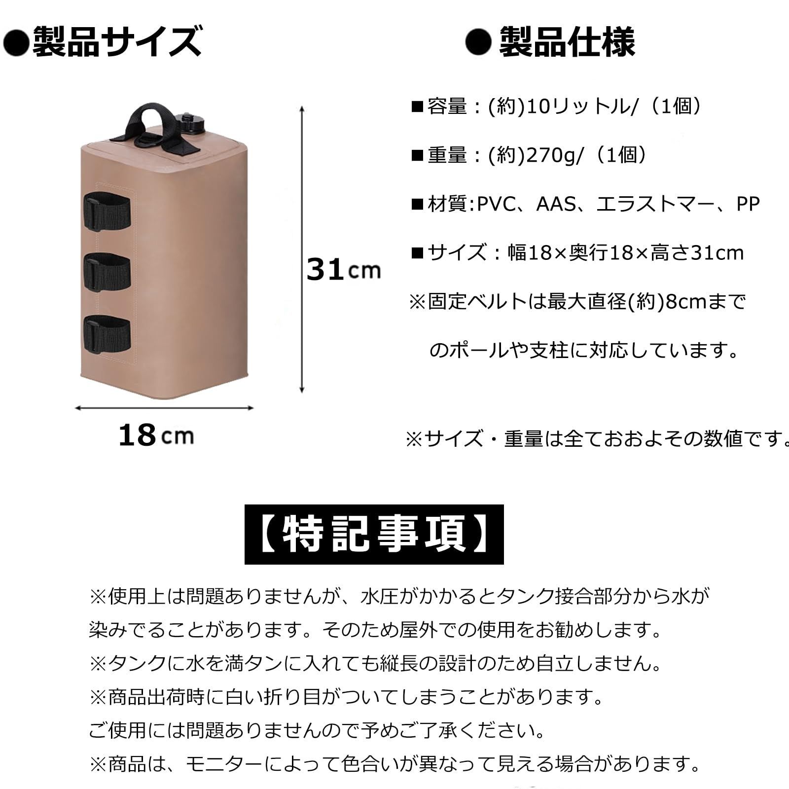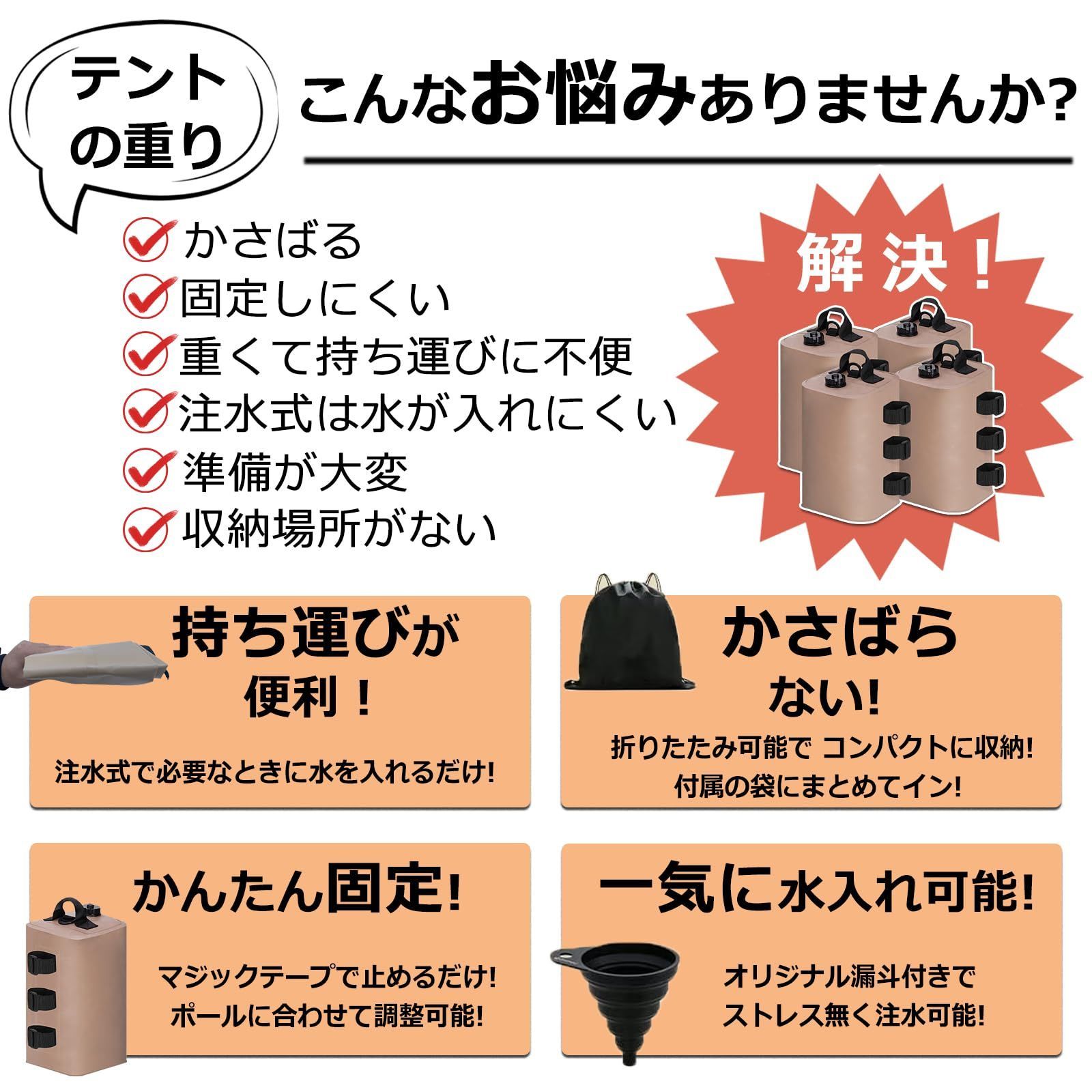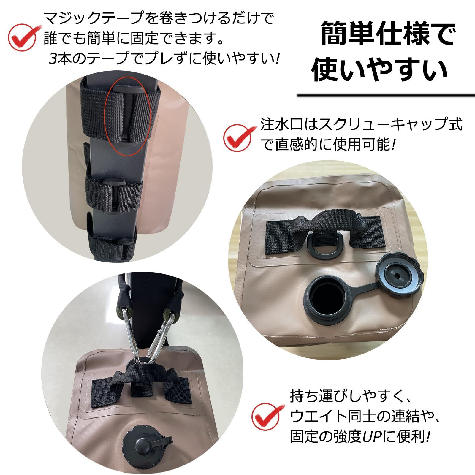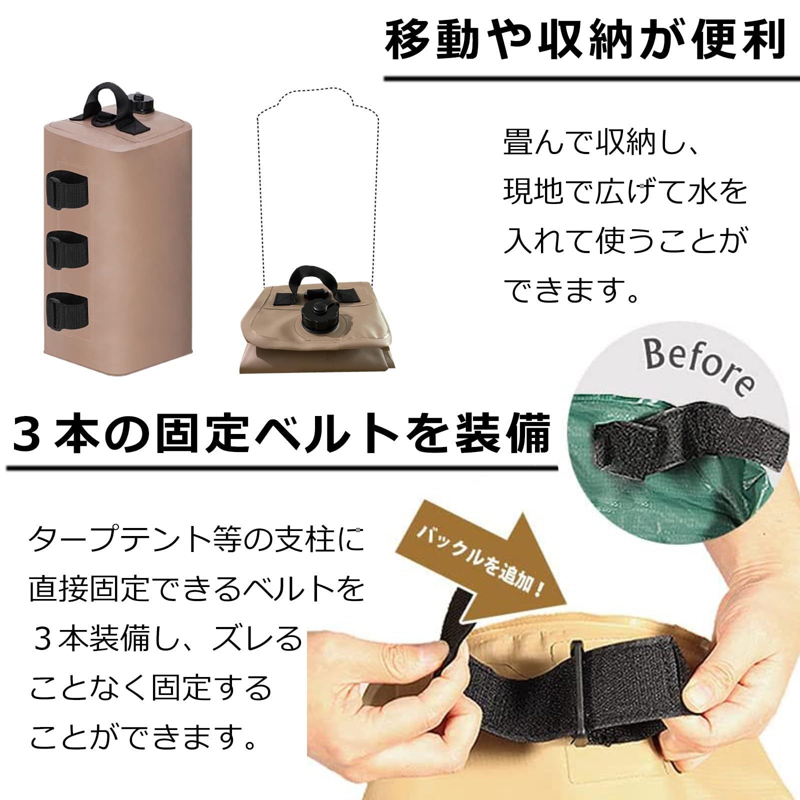 ■耐久性:注水式の為移動時はコンパクトに折り畳み、使う前に水道水を入れるだけ。 乾かして保管すれば繰り返し使えます。タープテント等の支柱に直接固定できるベルトを3本装備し、ズレることなく固定することができます。