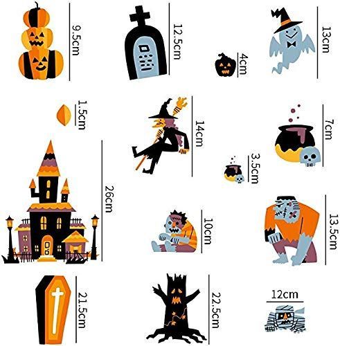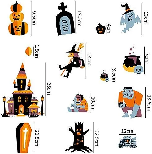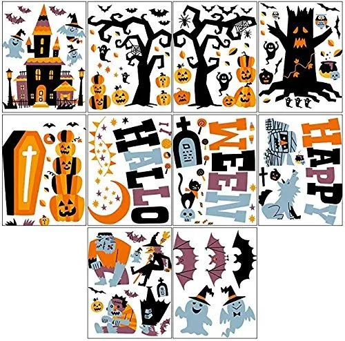 ステッカー1枚サイズ:29x22cm 柄:コウモリ お城 幽霊 お化け 魔女 オオカミ パンパイプ ネコ ドクロ 骨 ゾンビ 10枚/合計135pcs入り。