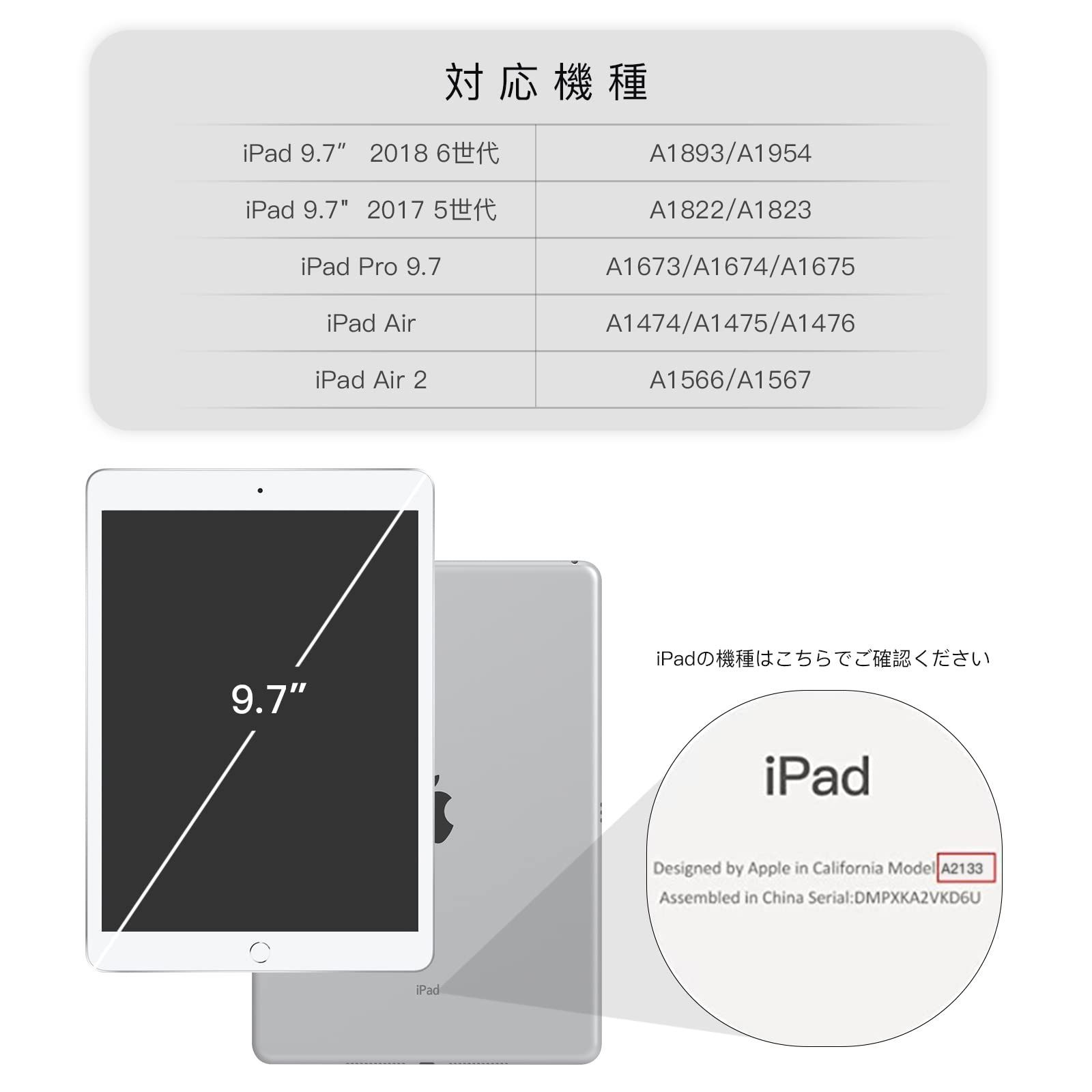 対応機種:2018年発売のiPad 9.7インチ (モデル番号: (A1893、A1954))/ iPad 9.7 2017版(モデル番号:A1822、A1823)/ iPad Air (モデル番号: A1474 、A1475、A1476) / iPad Air 2 (モデル番号: A1566、A1567 ) / iPad Pro 9.7専用ケース