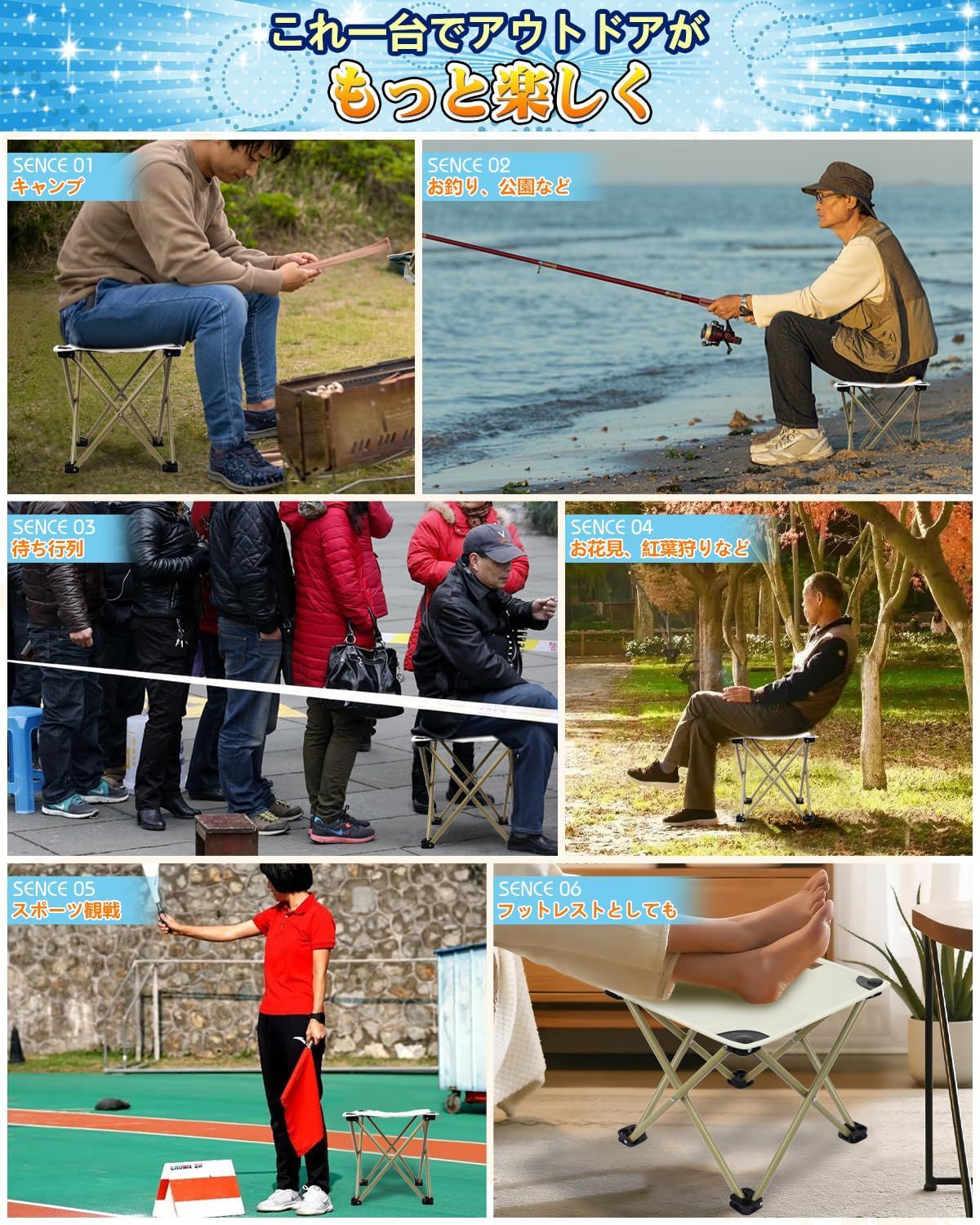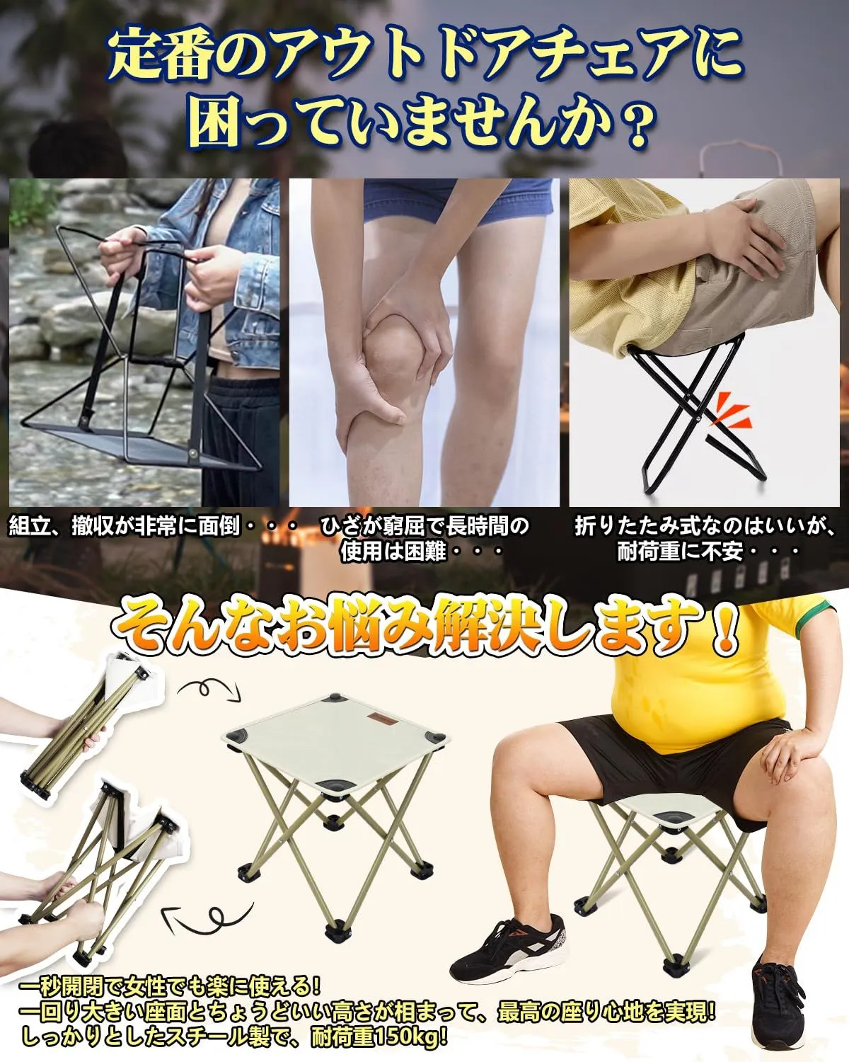 【軽量、コンパクトで持ち運び便利】普通の折りたたみ椅子、簡易チェア、携帯椅子より軽量でコンパク。 本体重量は635gとペットボトル1本程度。 専用の収納バッグが付属しているので、外出時の持ち運びが便利で、使わない時の保管も楽ちん。 コンパクトに折りたたんでリュックに収納でき、アウトドア活動(キャンプ、お花見、花火大会など)に秀逸な一品。 どこでもわずか3ステップ、取り出し、展開、座るだけ。 撤収の際もパパっと完成できる。 ??