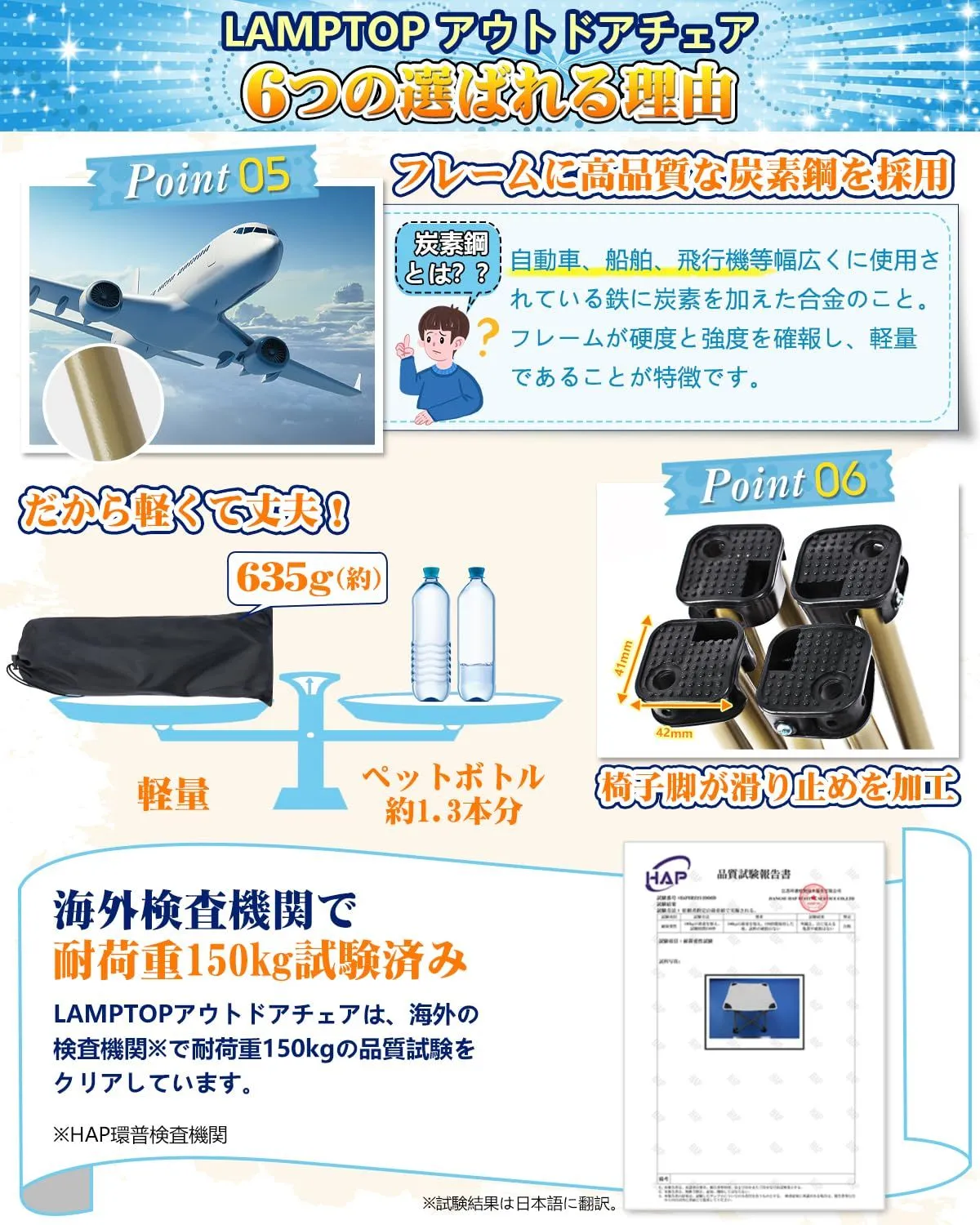【4本足による安定感、耐荷重180kg】航空宇宙品質のアルミニウム合金で作られた焚き火チェア、フレームは14mmまで厚くなり、軽さと堅牢性のバランスが良い。 X型の安定した支持構造で、150kgまでの耐荷重性を実現。(海外の第三者試験機関による180kgの荷重試験に合格)市販の3本足チェアに比べ、4本の足は厚くなった滑り止め設計で、ズレにくく、安定性も抜群。 オフィスやお部屋で足の踏み台にして、足元に置いて踏むこともできます。 ??